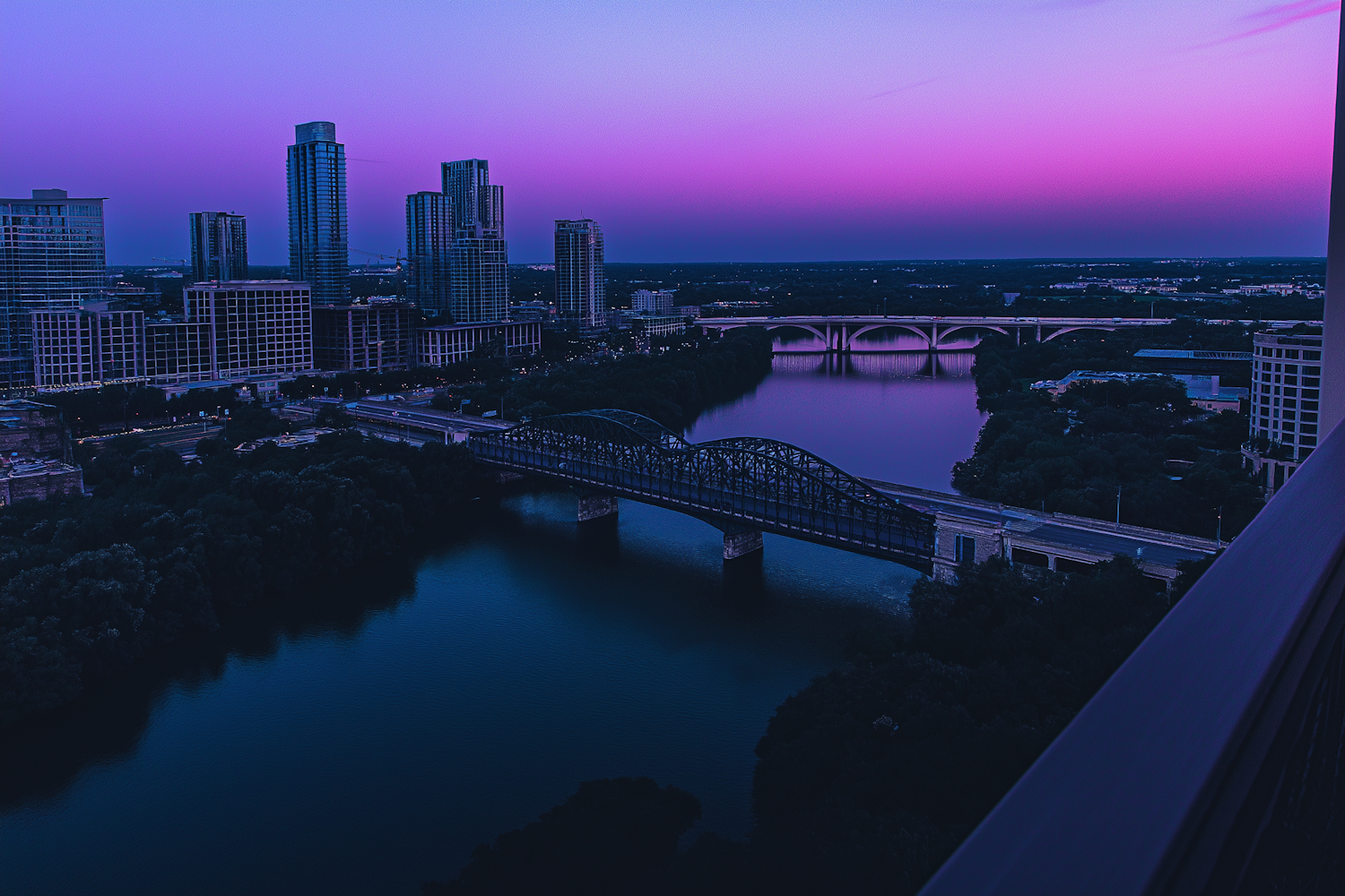 Stunning cityscape at dusk with vibrant purple sky, skyscrapers, and bridges over a reflective river.
