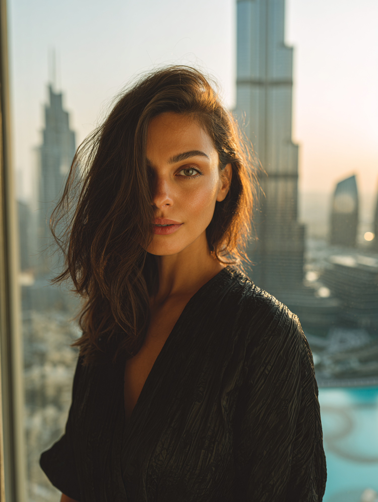 A woman with brown hair in a black outfit stands by a window with a cityscape and skyscrapers in the background during golden hour.