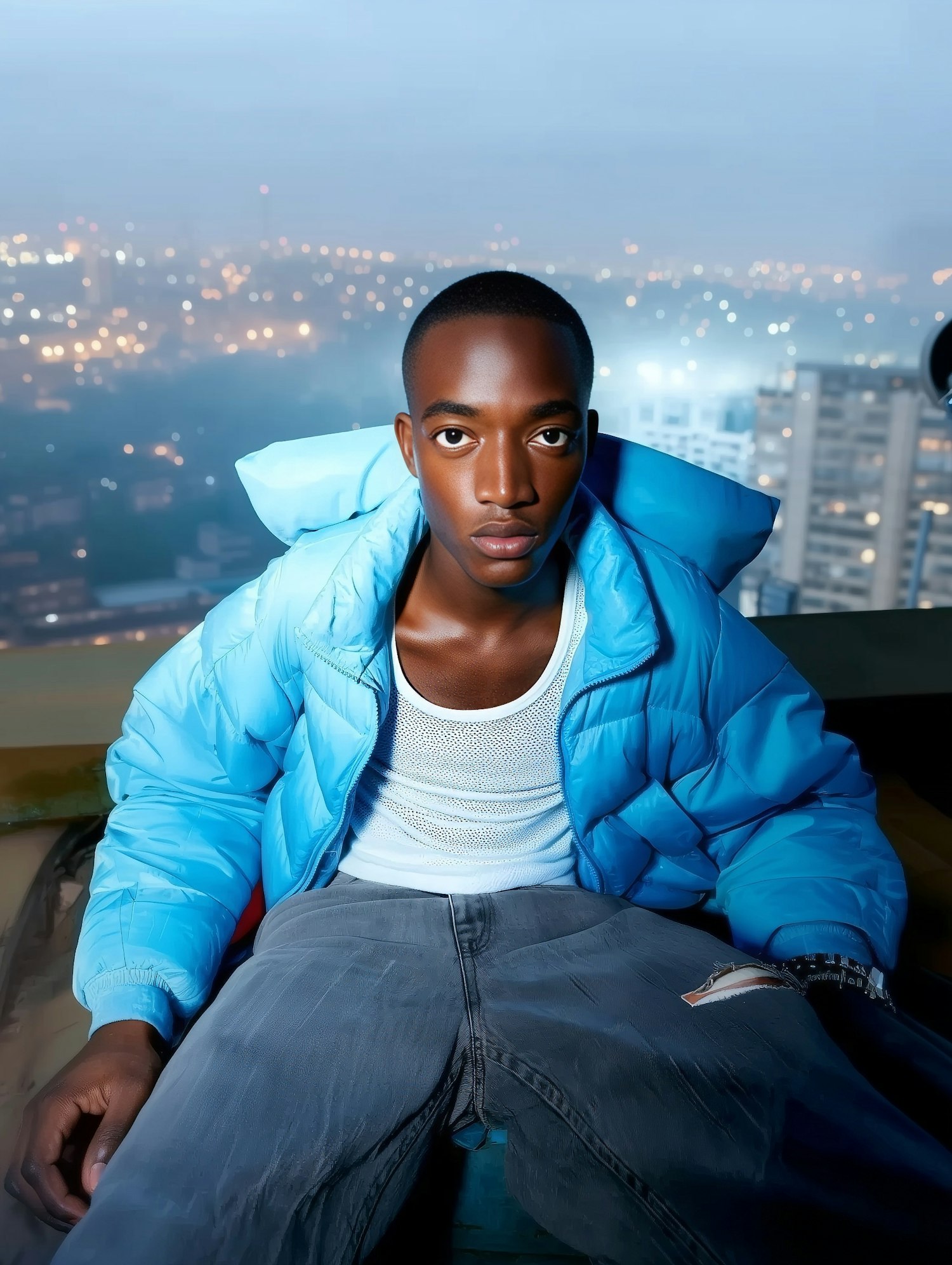 Stylish young man in a blue puffer jacket and ripped jeans, sitting against a city nightscape with glowing lights in the background.