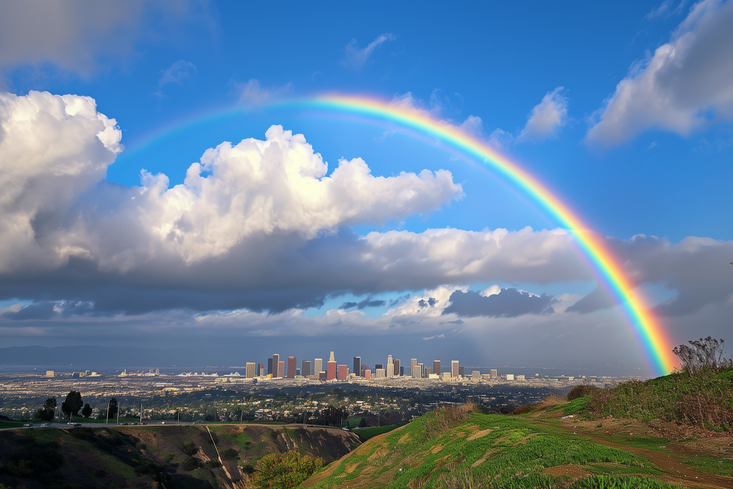 A vivid rainbow arches over a city skyline with lush green hills in the foreground and dramatic clouds in a bright blue sky.