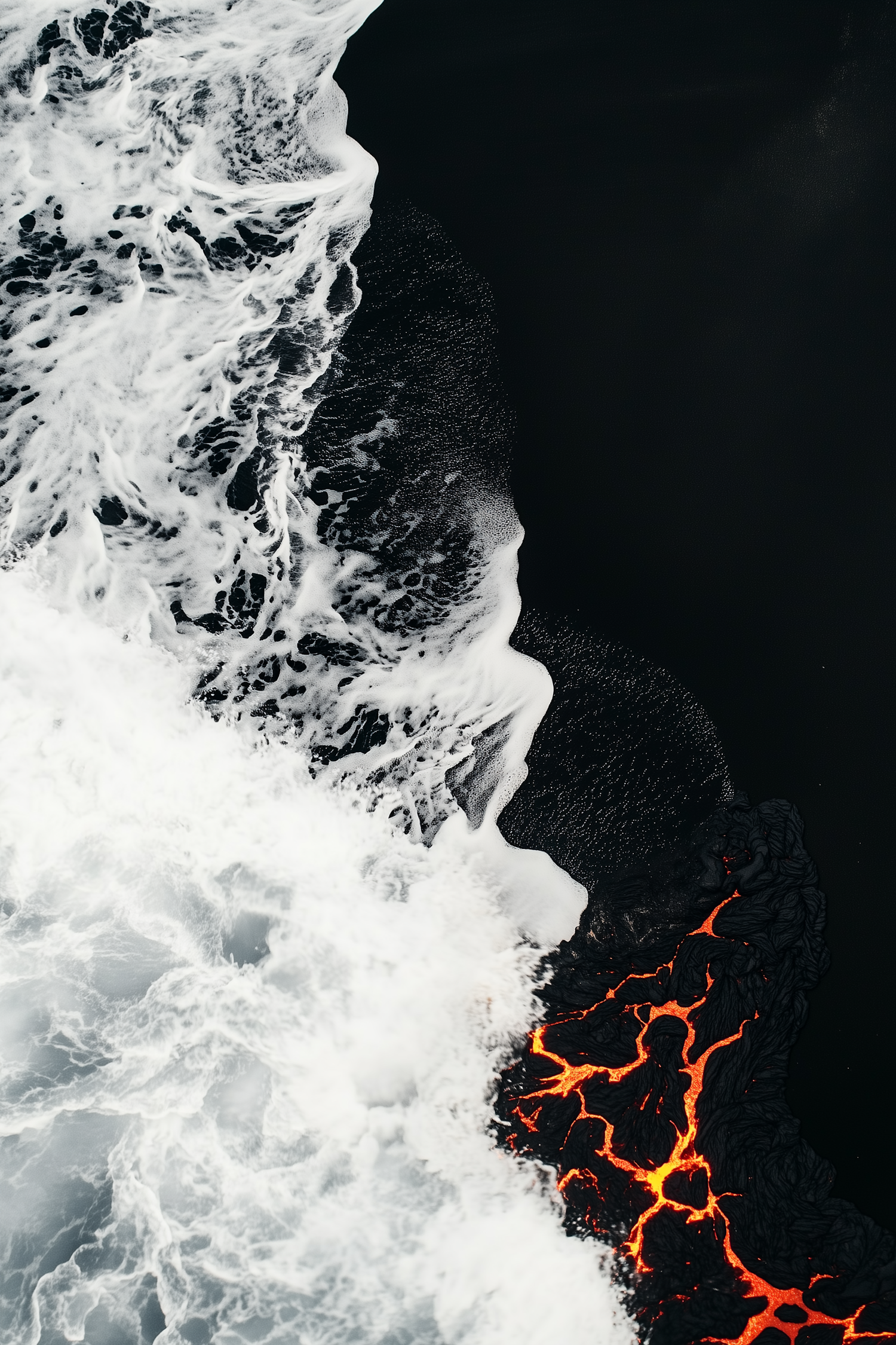 Aerial view of ocean waves meeting vibrant orange lava, creating a striking contrast of elements and colors.