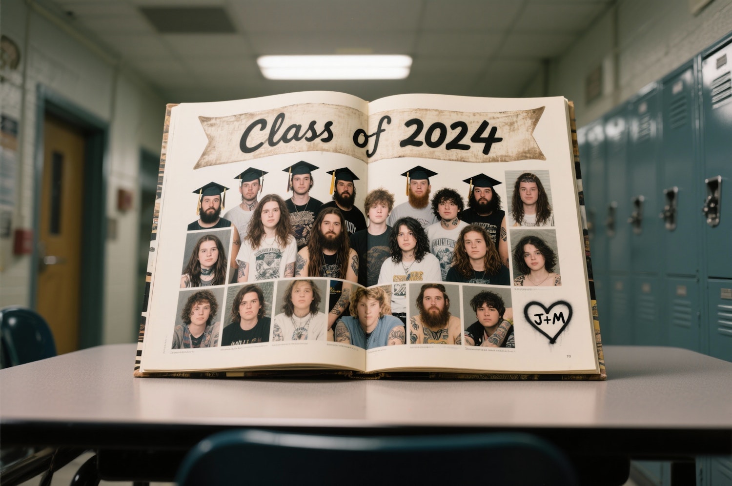 A photograph of an open high school yearbook displaying a double-page spread of graduation photos. The photos showcase a diverse group of students with visible tattoos, full beards, and deliberately unkempt, long hair, all staring directly at the camera with expressions of youthful defiance. A faded banner across the top reads “Class of 2024” and a single spray-painted heart adorns the lower corner with the initials “J+M”. The background is a blurred, institutional hallway with lockers and dimly lit fluorescent lights, contributing to the raw and unfiltered portrayal of modern adolescence