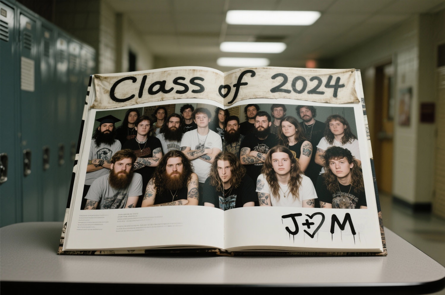 A photograph of an open high school yearbook displaying a double-page spread of graduation photos. The photos showcase a diverse group of students with visible tattoos, full beards, and deliberately unkempt, long hair, all staring directly at the camera with expressions of youthful defiance. A faded banner across the top reads “Class of 2024” and a single spray-painted heart adorns the lower corner with the initials “J+M”. The background is a blurred, institutional hallway with lockers and dimly lit fluorescent lights, contributing to the raw and unfiltered portrayal of modern adolescence