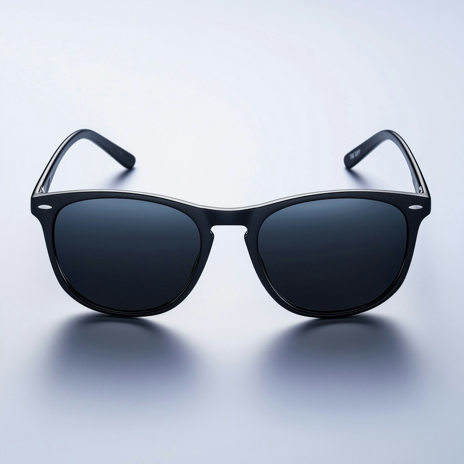 Sleek black wayfarer sunglasses with dark lenses on a light gray background, perfect for a stylish and timeless look.