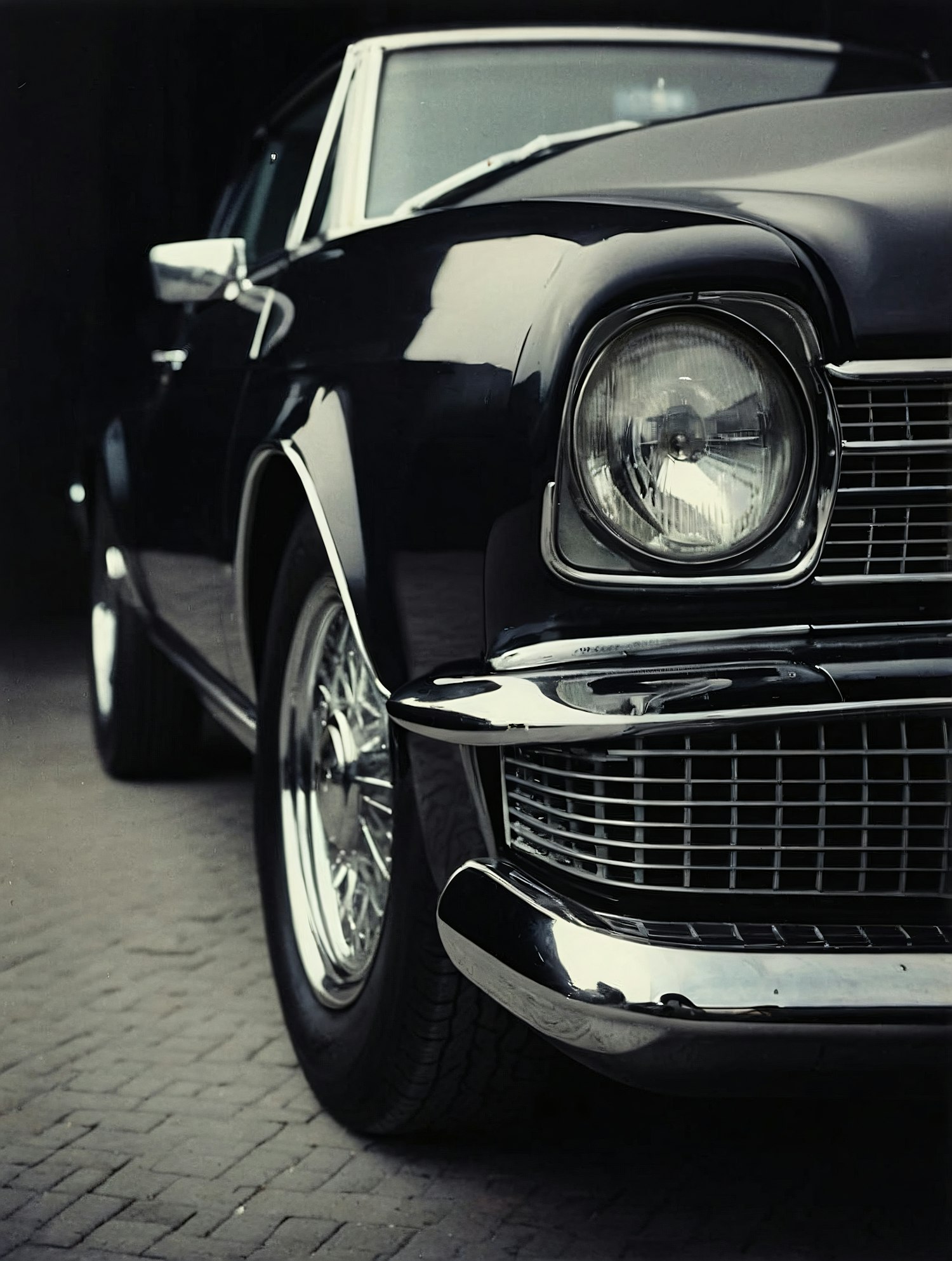Close-up of a classic car's front, highlighting its sleek black finish, chrome details, and vintage design elements.