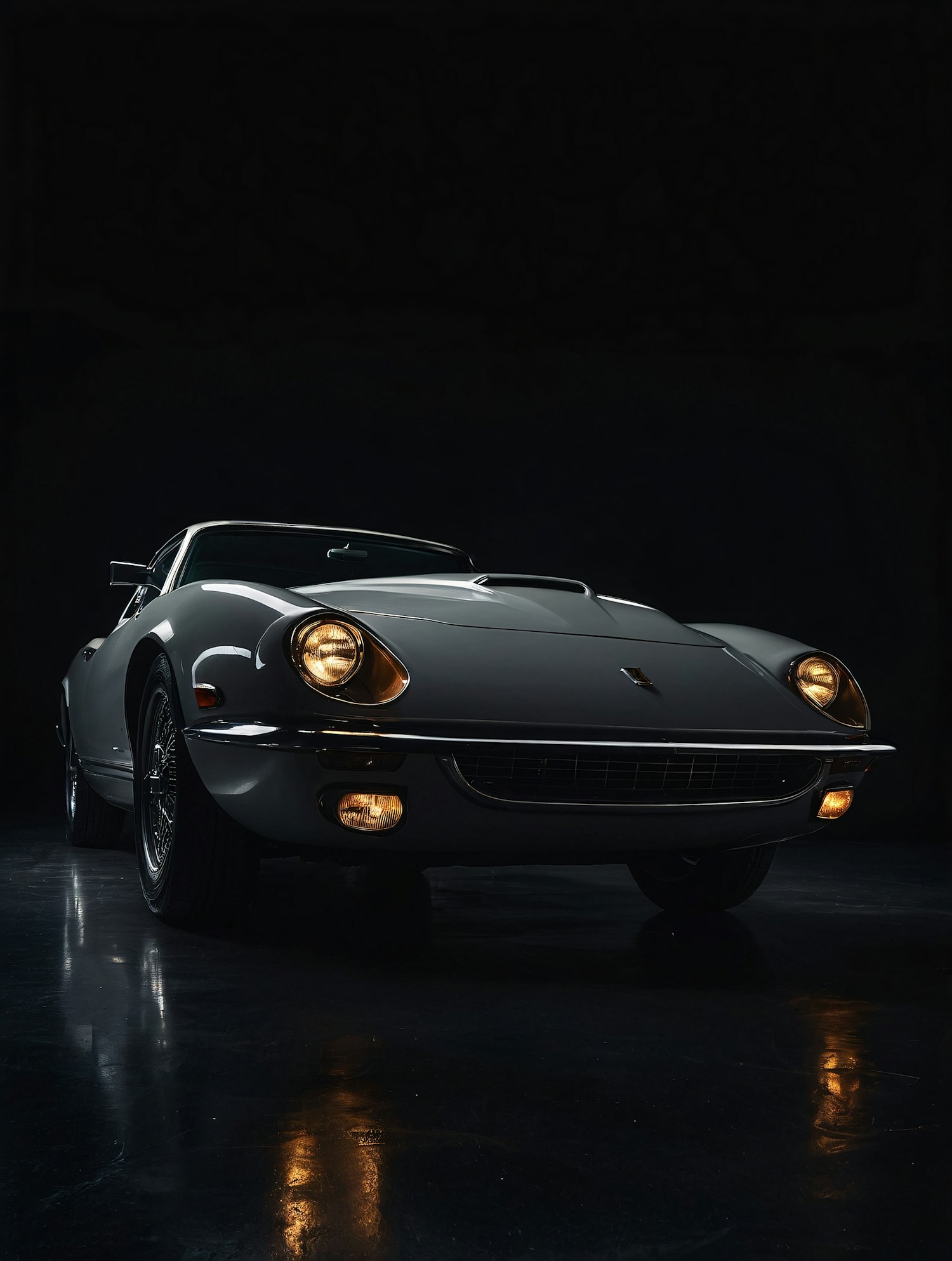 Classic silver sports car with illuminated headlights against a dark background, showcasing sleek design and vintage charm.