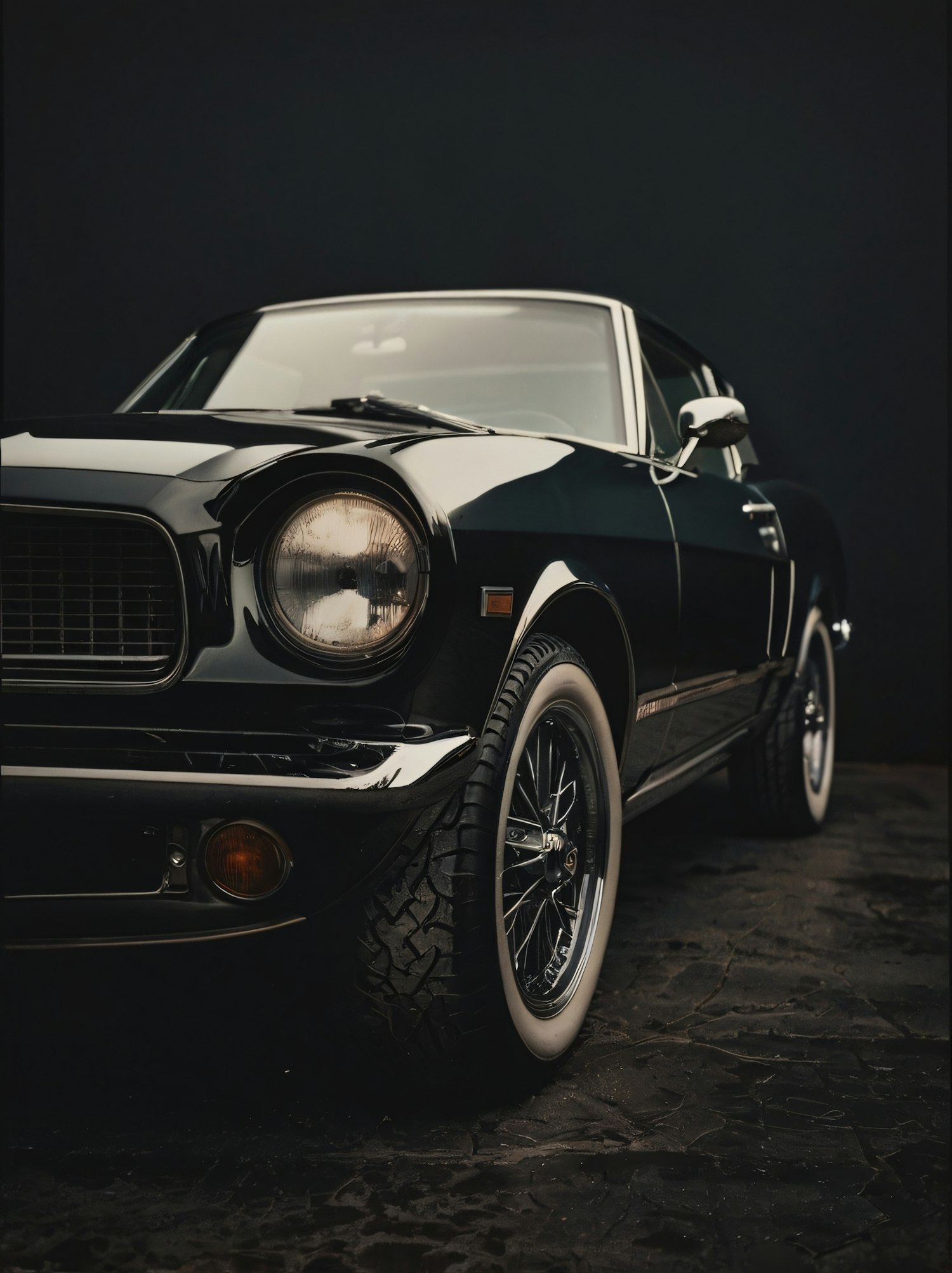 Sleek black classic car with chrome details and whitewall tires, exuding vintage elegance against a dark backdrop.