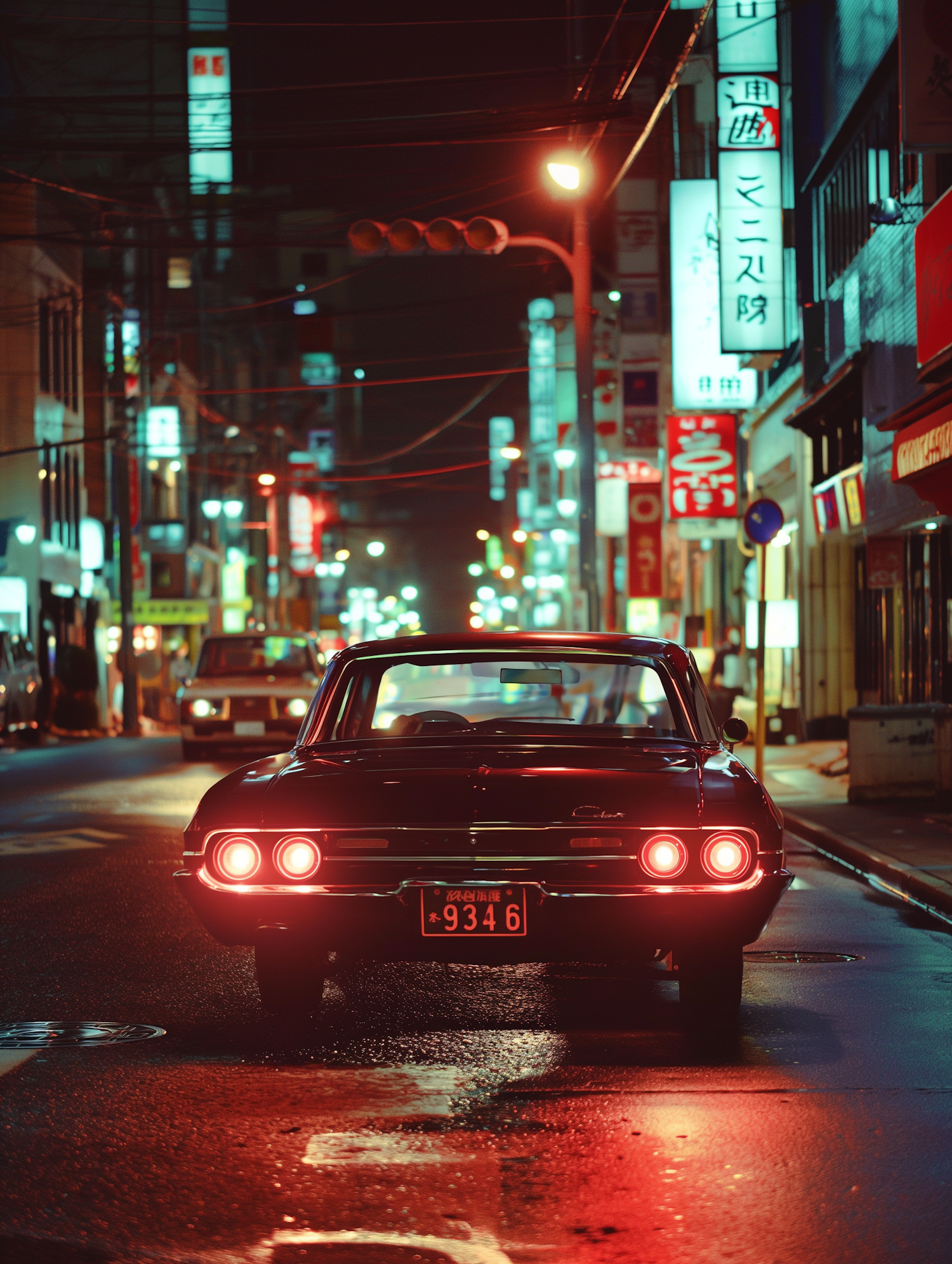 Vintage car with glowing taillights on a neon-lit street, reflecting vibrant colors on wet pavement at night.