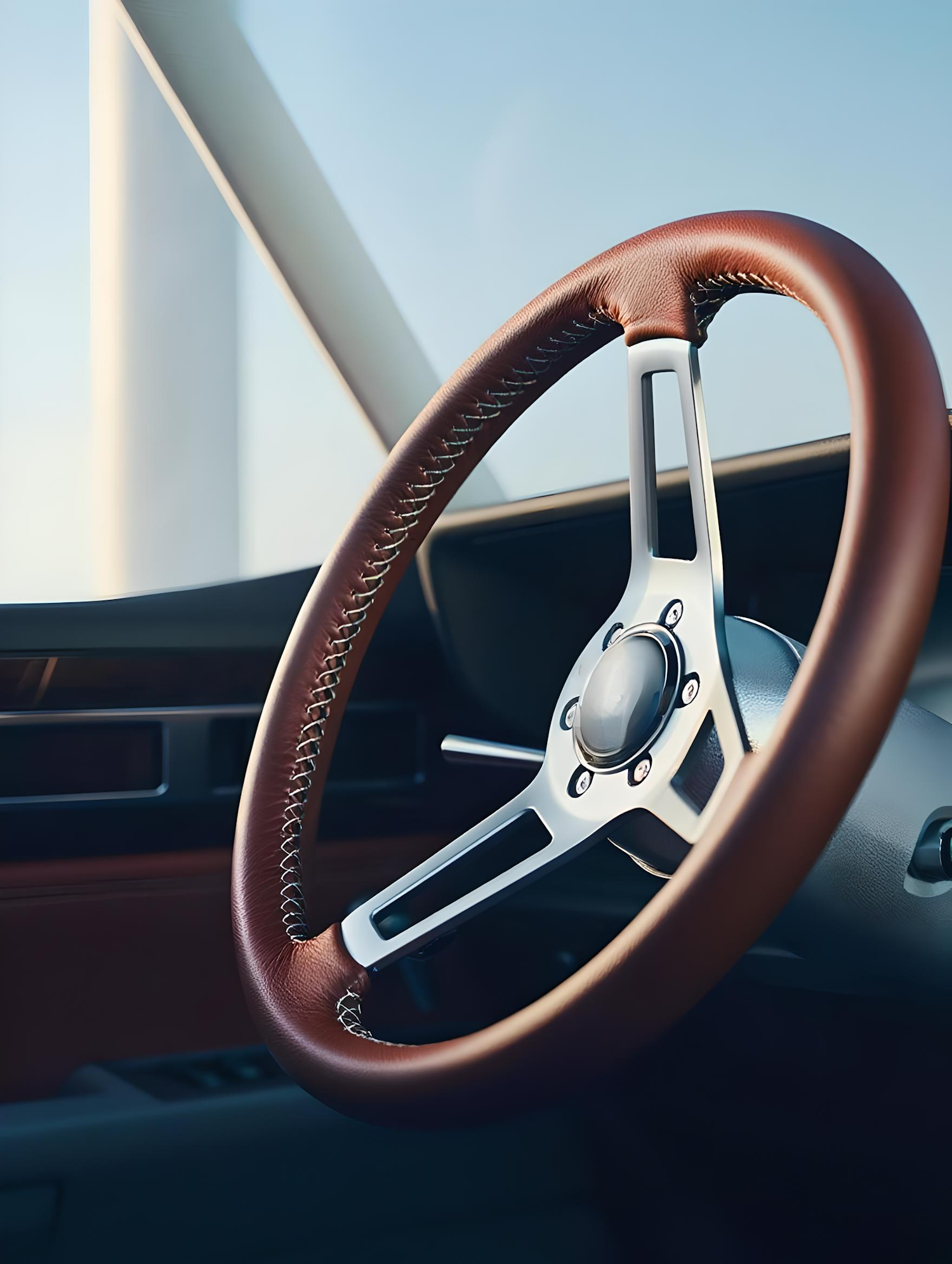 Close-up of a classic car steering wheel with brown leather and polished metal, showcasing retro design and craftsmanship.