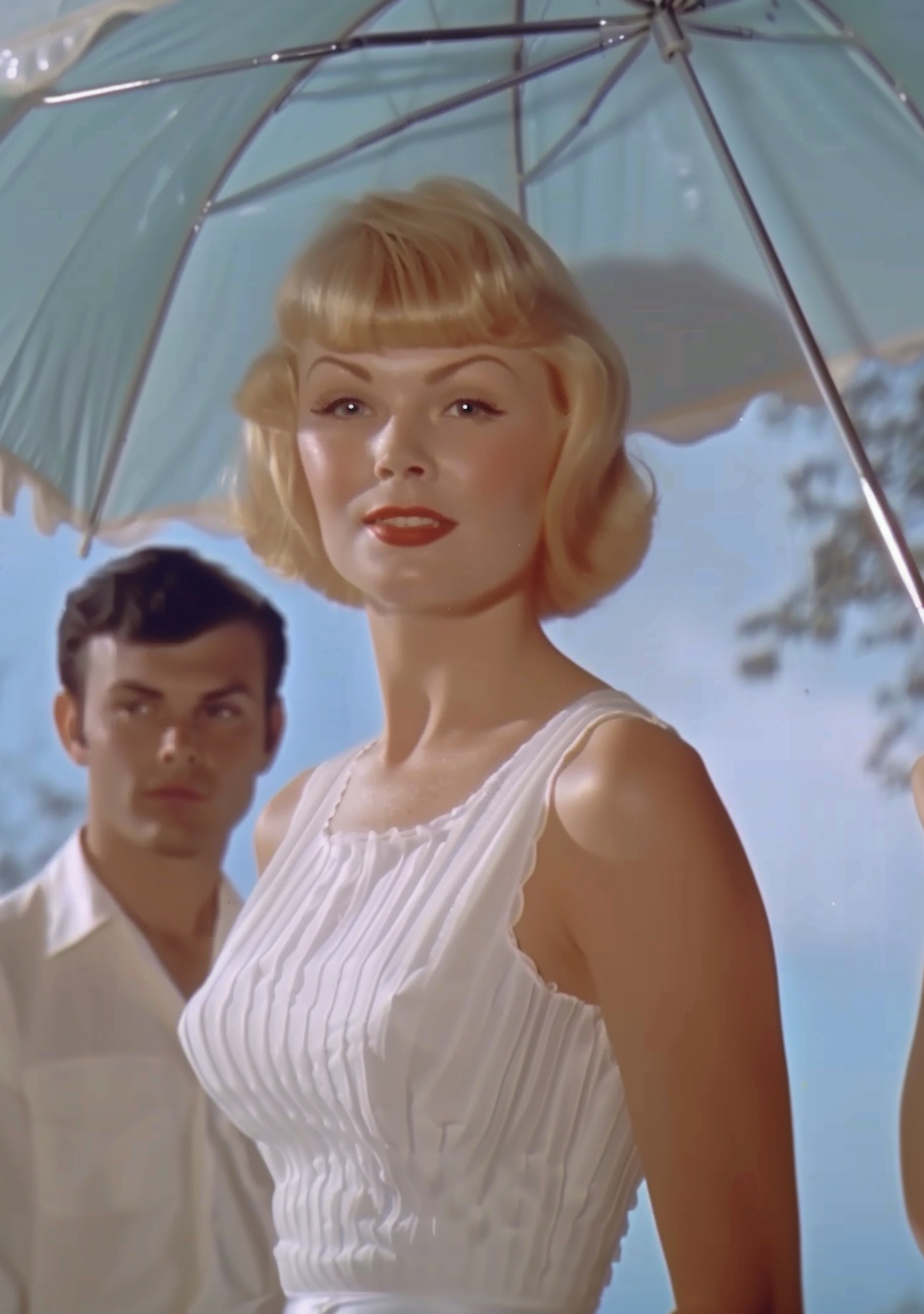 Blonde woman in white dress under blue umbrella with a man in the background, set against a sunny outdoor backdrop.