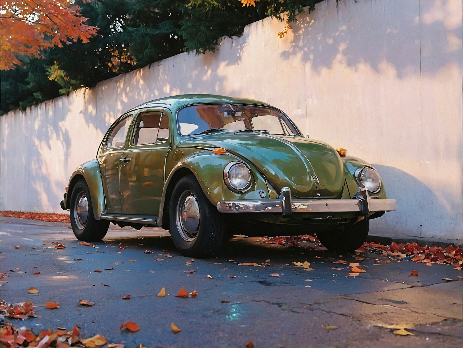 Classic green Volkswagen Beetle parked on a leaf-strewn street, reflecting autumn's charm with vintage curves and warm seasonal colors.