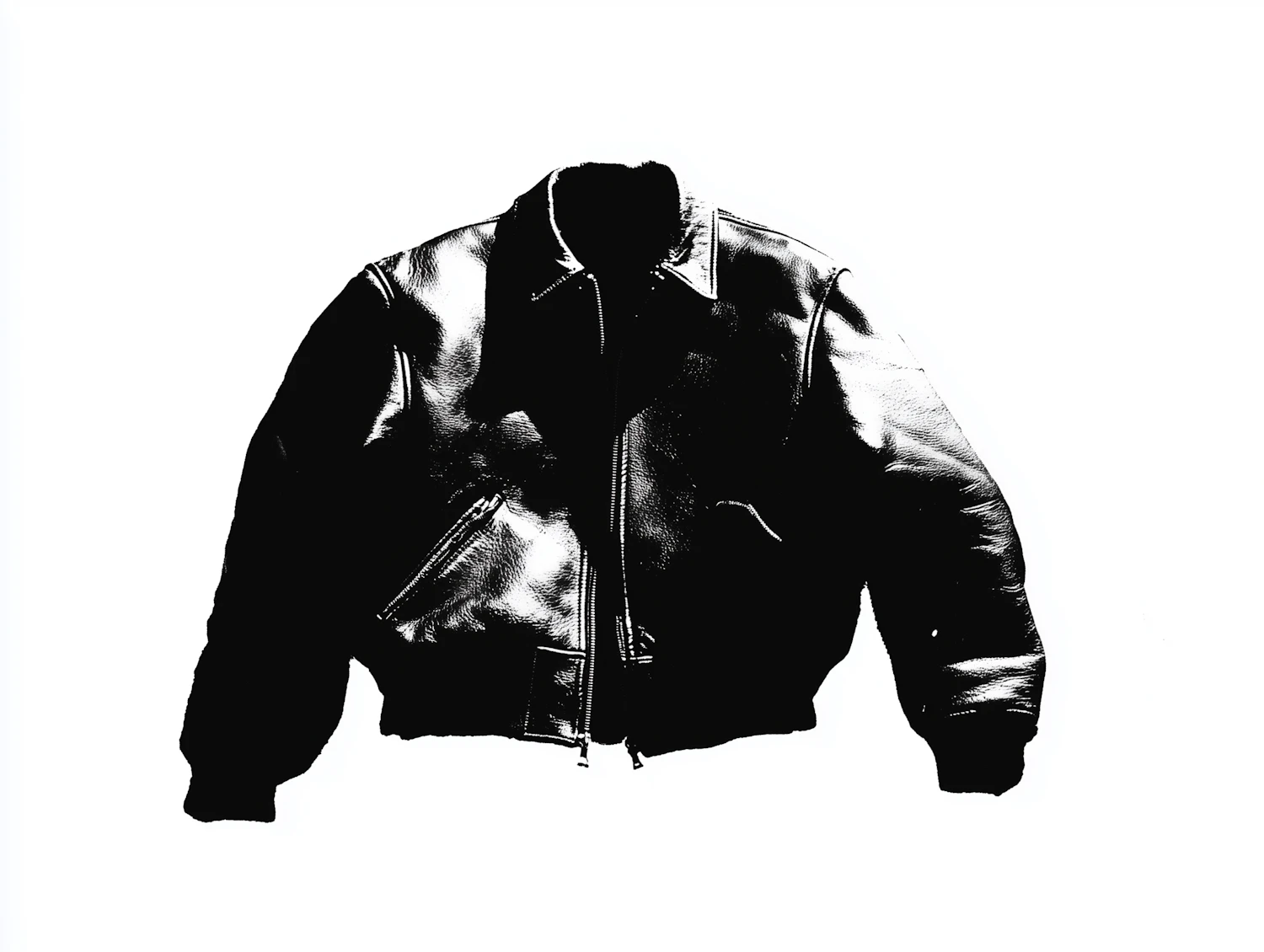 A black leather jacket with a classic design, featuring a front zipper, side pockets, and ribbed cuffs, displayed on a white background.