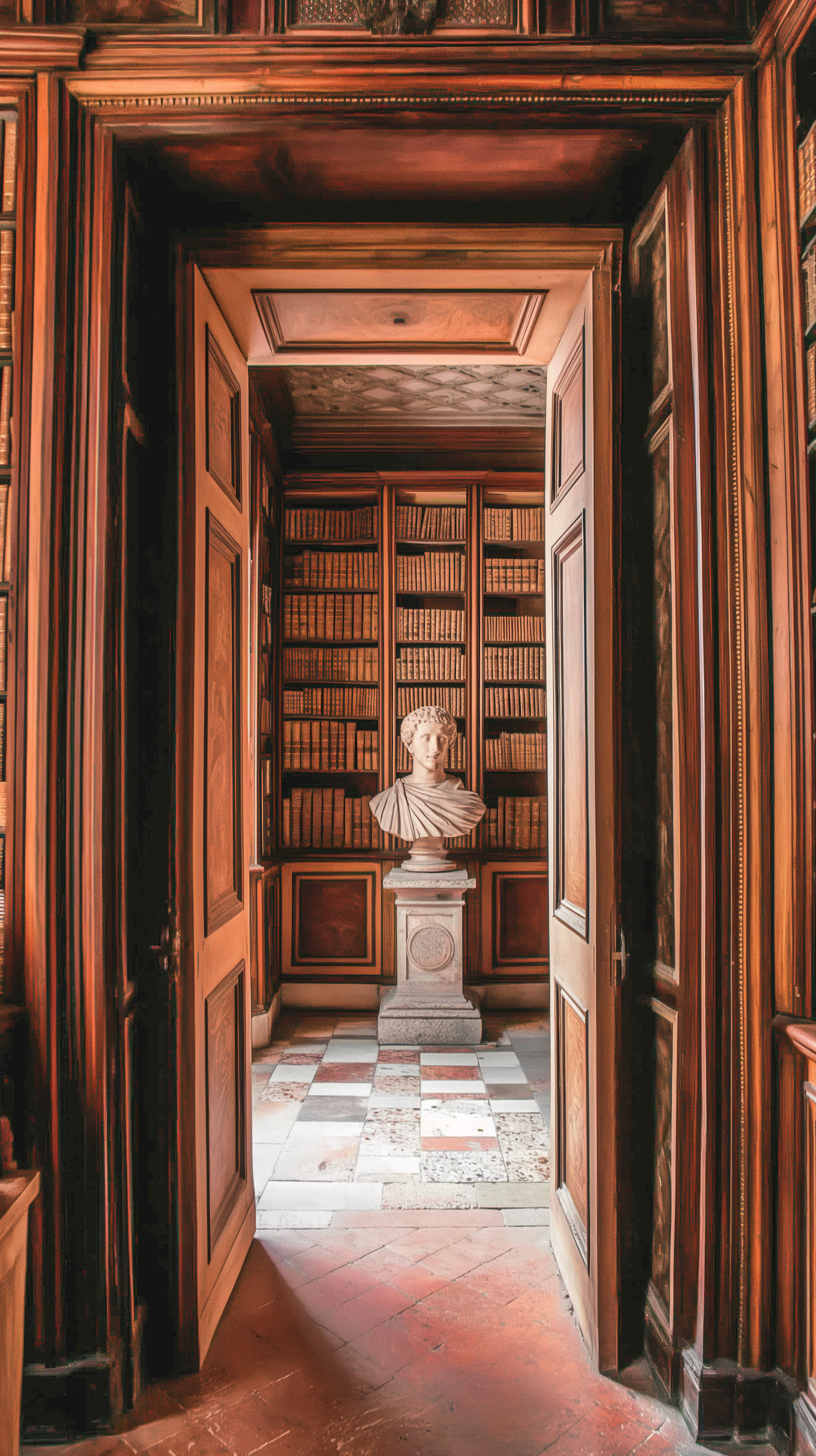 Elegant library with wooden paneling, a Roman bust, and shelves of books. Warm lighting enhances the classical ambiance.