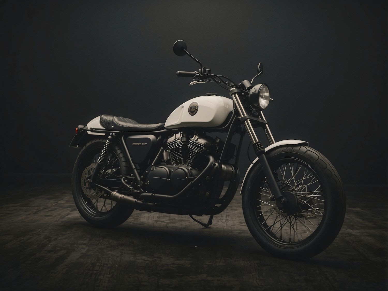 Classic white motorcycle with black accents, featuring a vintage design and sleek lines against a dark background.