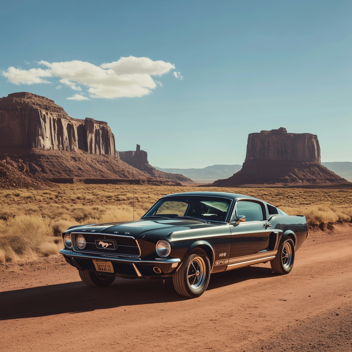 Classic black Ford Mustang GT Fastback on a desert road with Monument Valley's iconic rock formations in the background.
