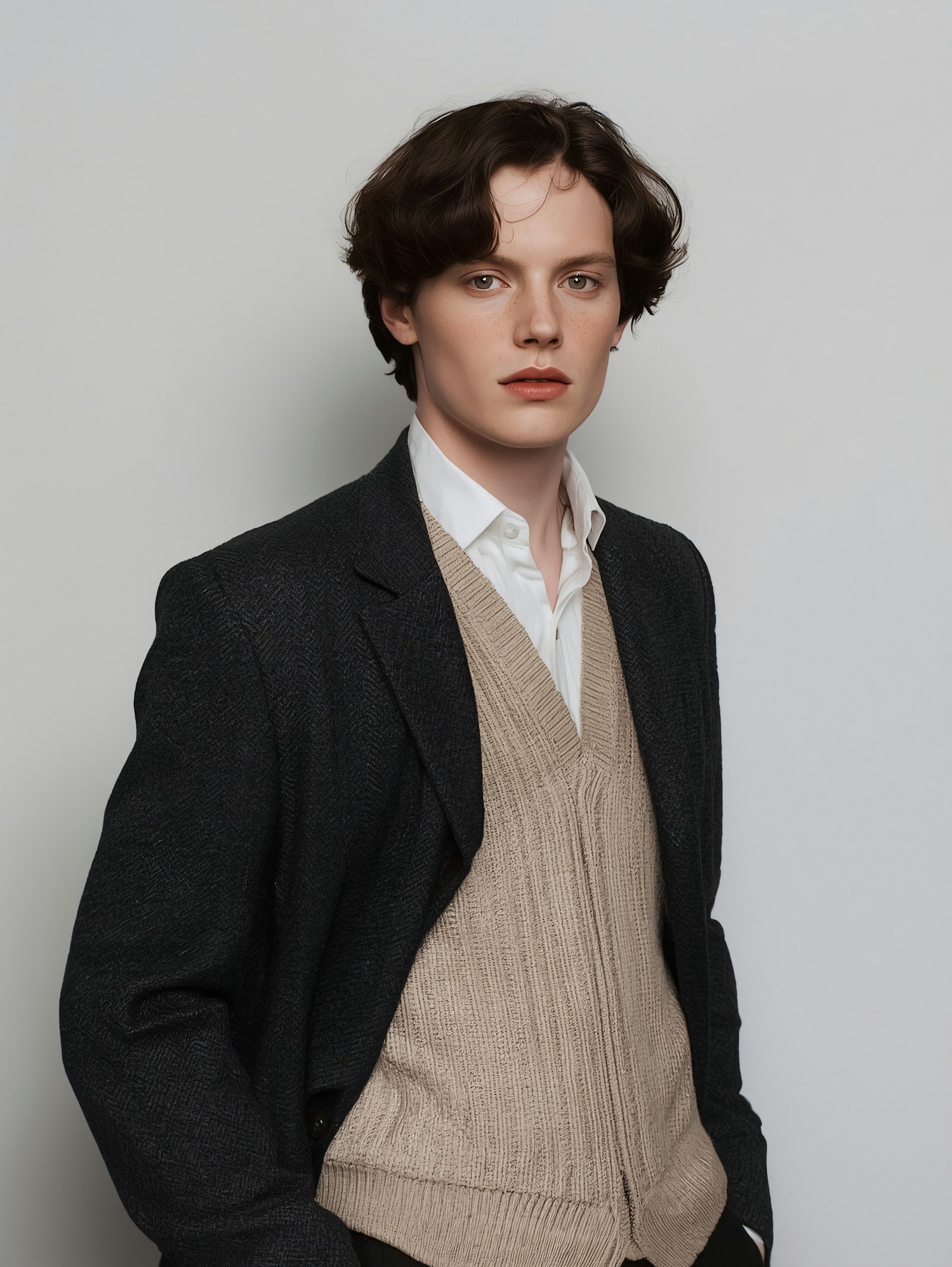 A young person in a dark blazer and beige vest poses against a plain background, showcasing a classic and refined style.