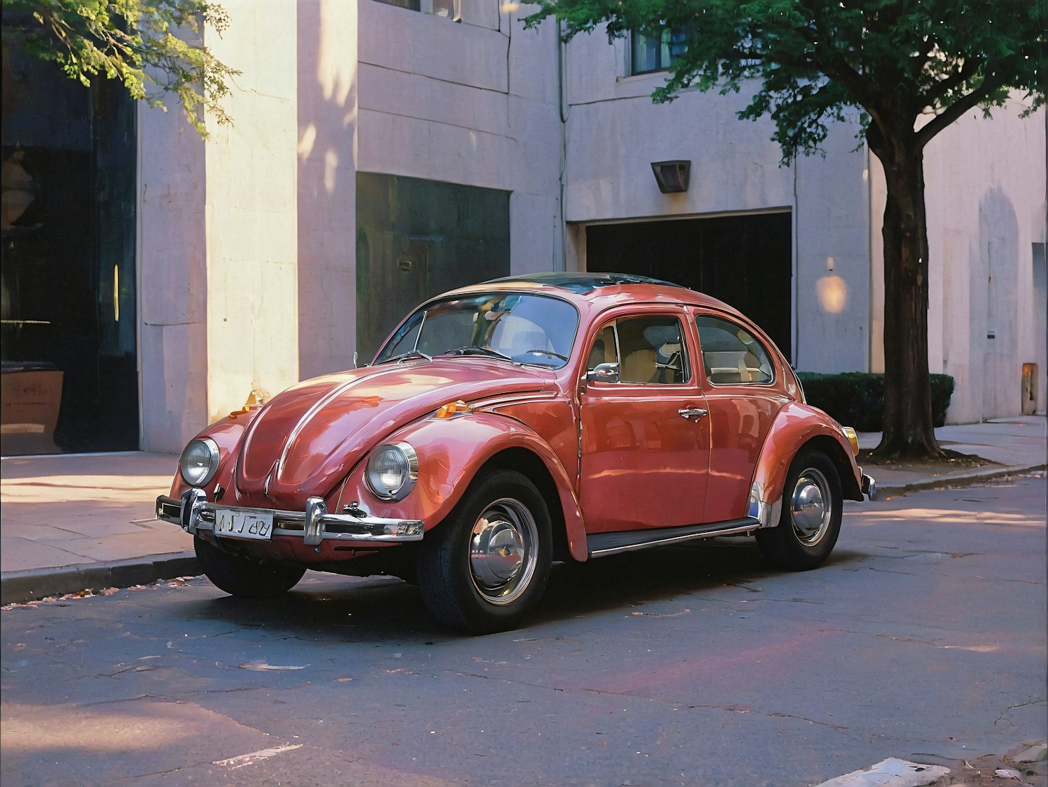 Classic red Volkswagen Beetle parked on a quiet city street, reflecting sunlight with vintage charm and chrome details.