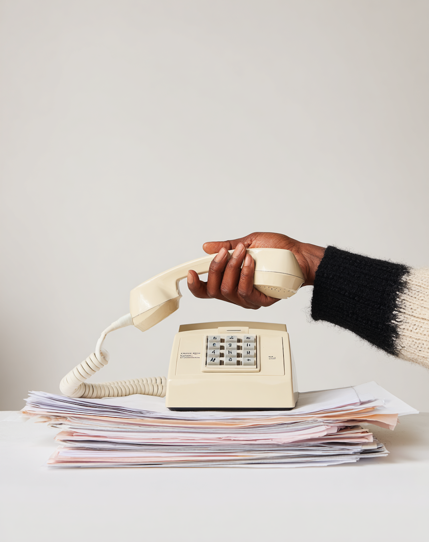 A hand holding a vintage beige telephone handset, resting on a stack of papers, against a simple background.