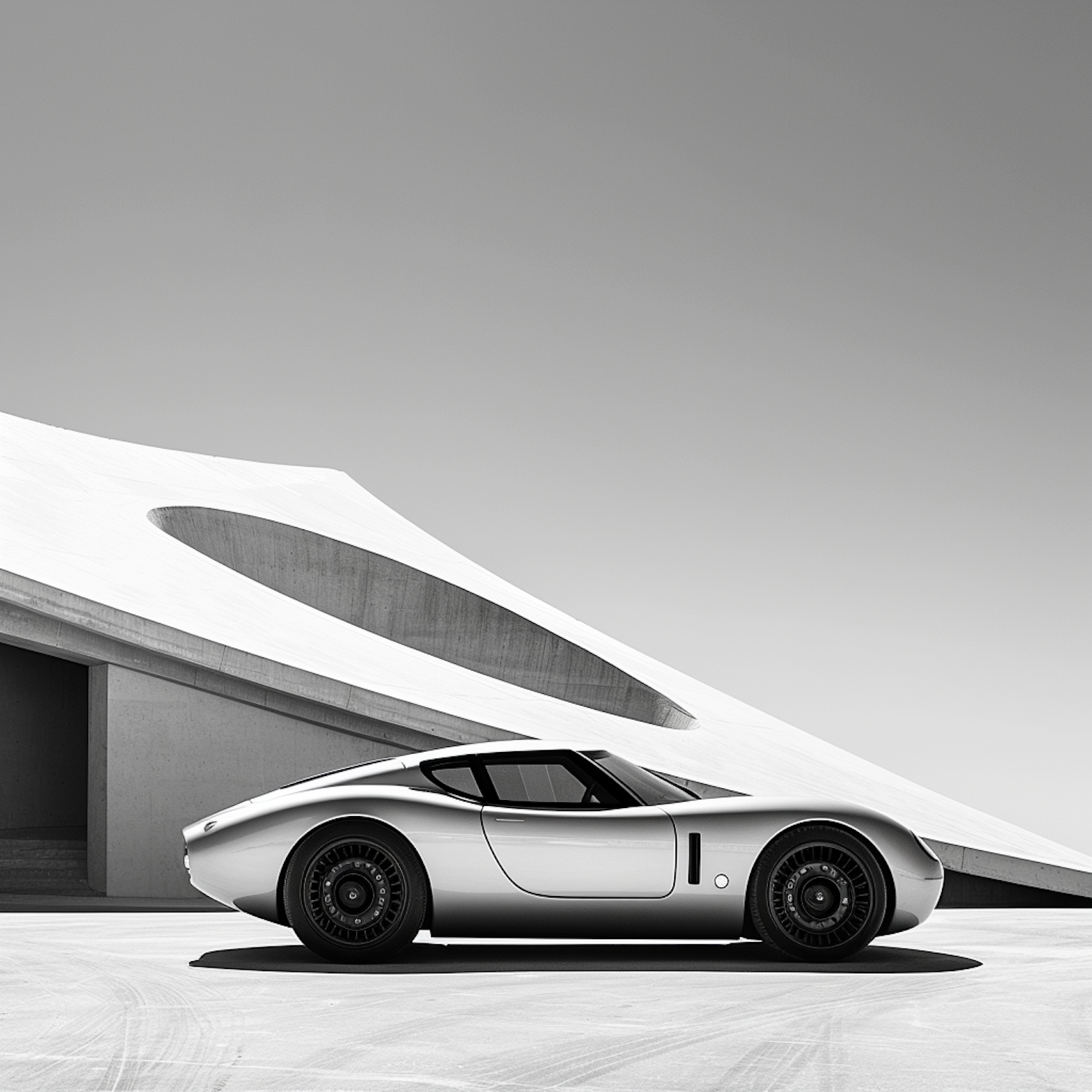 Futuristic silver sports car parked by a modern concrete building with a circular roof opening, in a monochromatic setting.