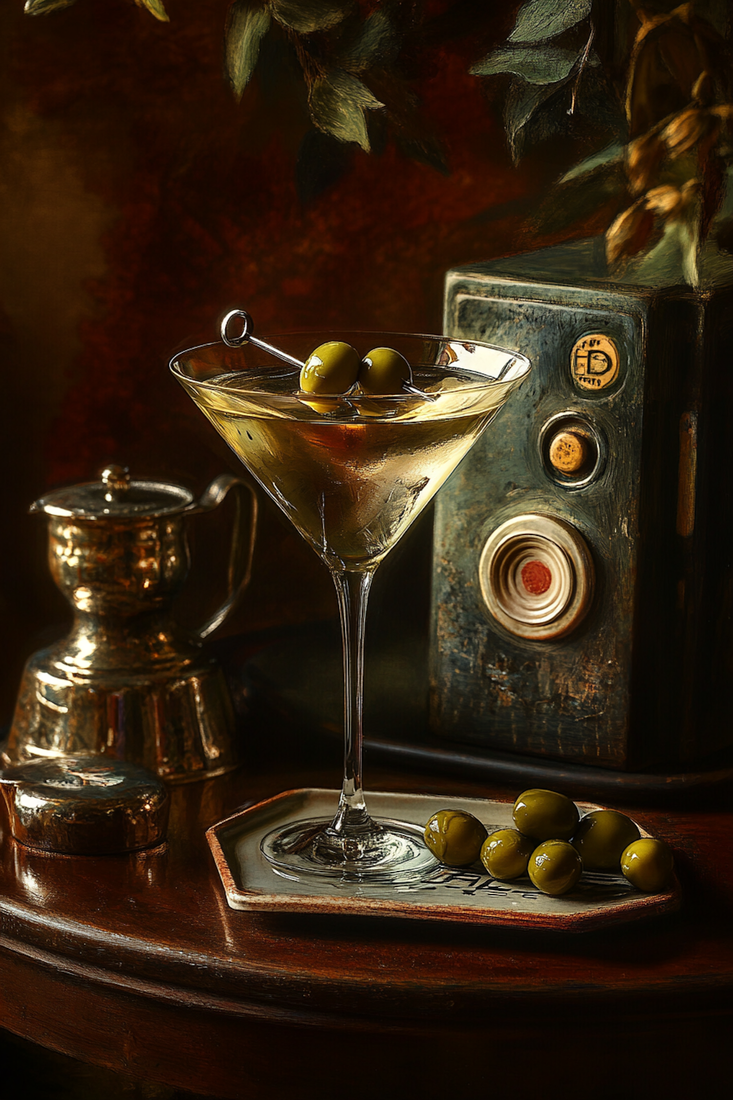 Elegant martini with olives beside a vintage camera and silver pitcher on a wooden table, creating a nostalgic ambiance.