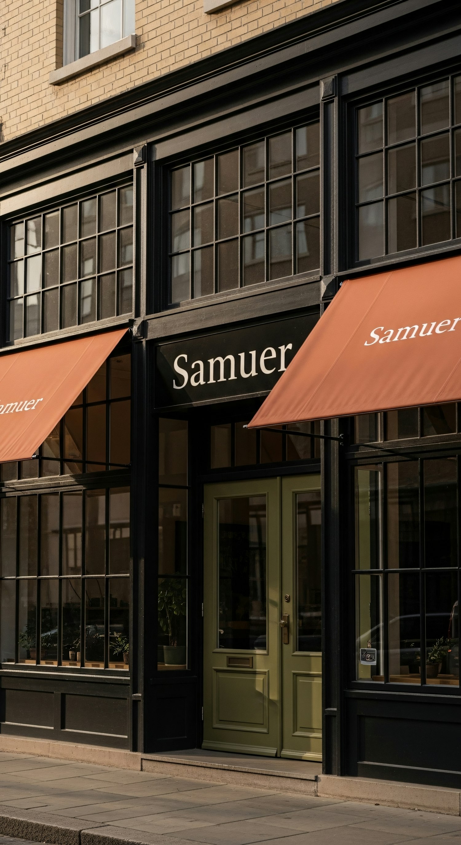 Charming storefront with beige brick facade, black-framed windows, orange awnings, and a light green door. Perfect urban shop design.