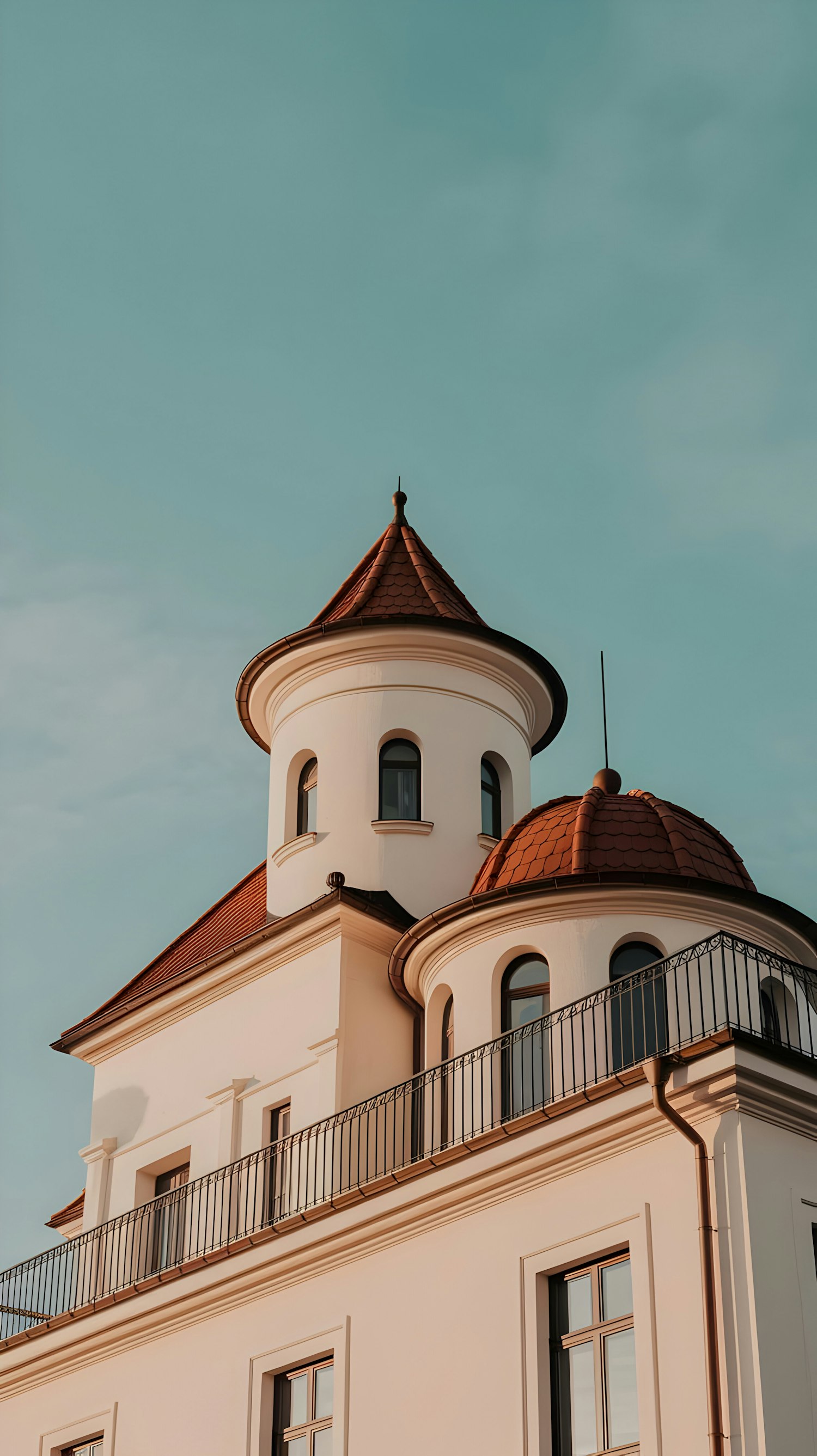 Elegant cream-colored building with red-tiled towers and arched windows under a clear blue sky. Classic architecture with warm lighting.