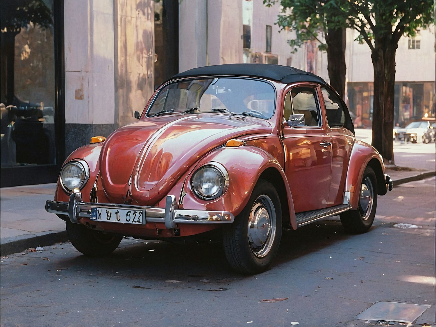 Classic red Volkswagen Beetle parked on a city street, featuring chrome accents and a black convertible top.