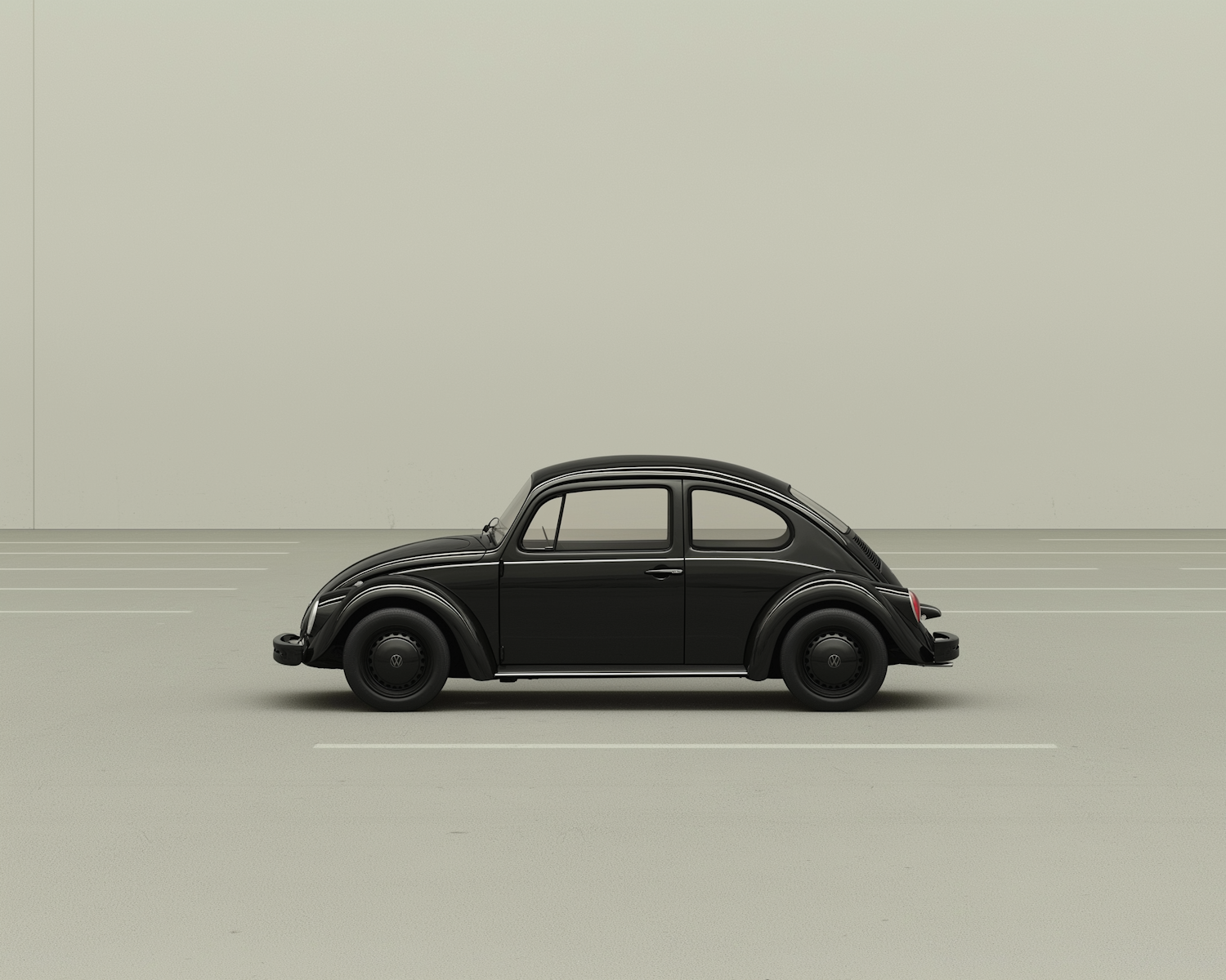 Classic black Volkswagen Beetle parked in an empty lot, showcasing its iconic design against a minimalist background.