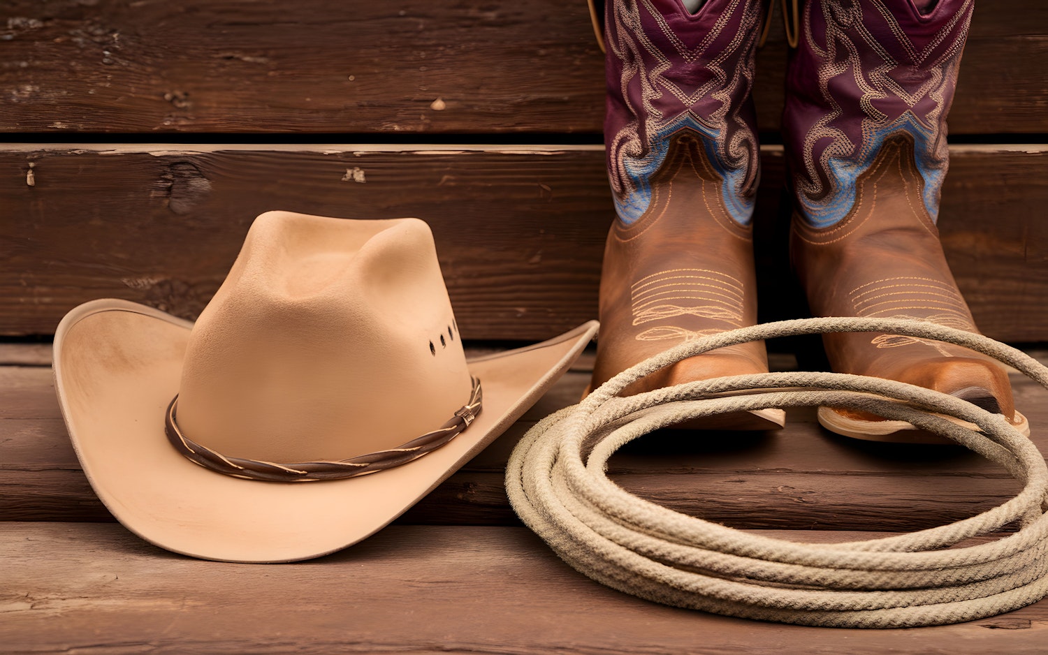 Cowboy hat, boots, and lasso on a rustic wooden surface, showcasing Western style with intricate boot stitching and braided hat band.