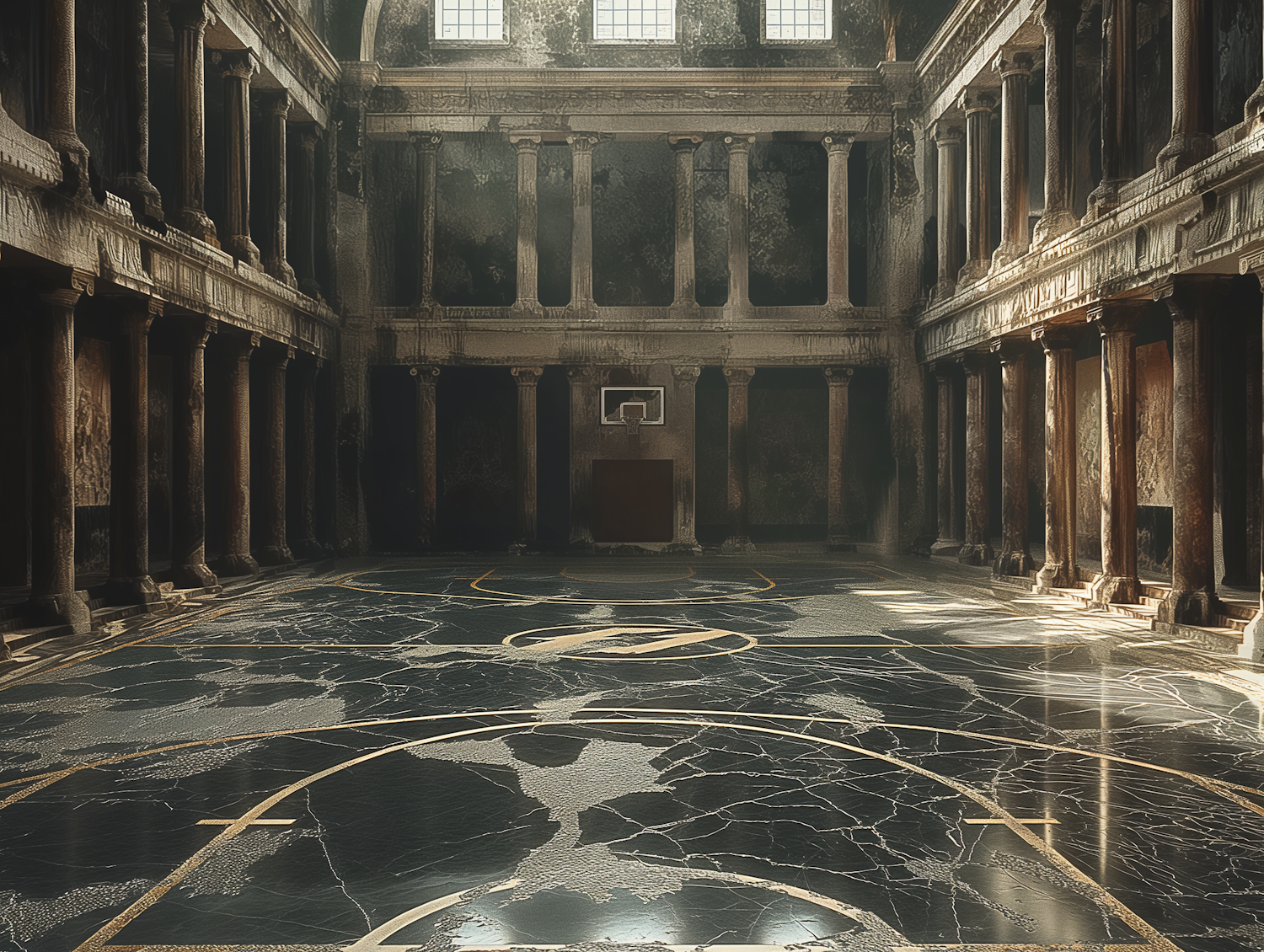 Ancient hall with marble floor resembling a basketball court, blending classical architecture with modern sports elements.