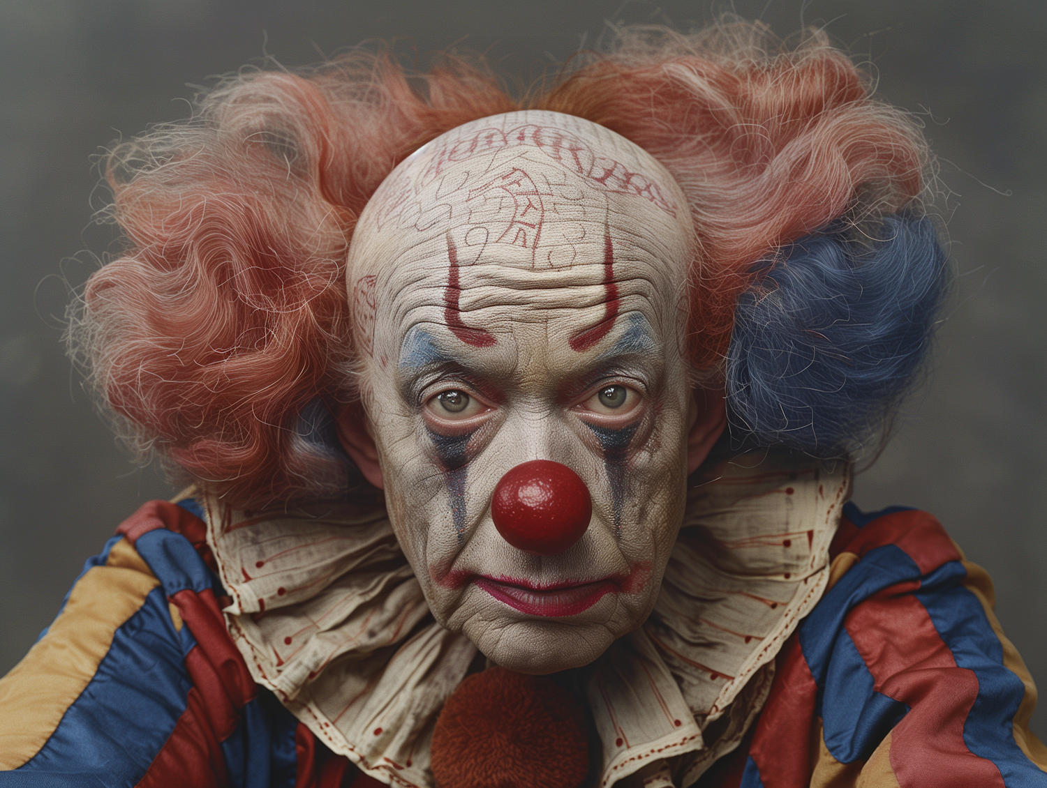 A clown with red and blue hair, intricate face paint, and a colorful costume stares intensely. Dramatic and vivid portrait.