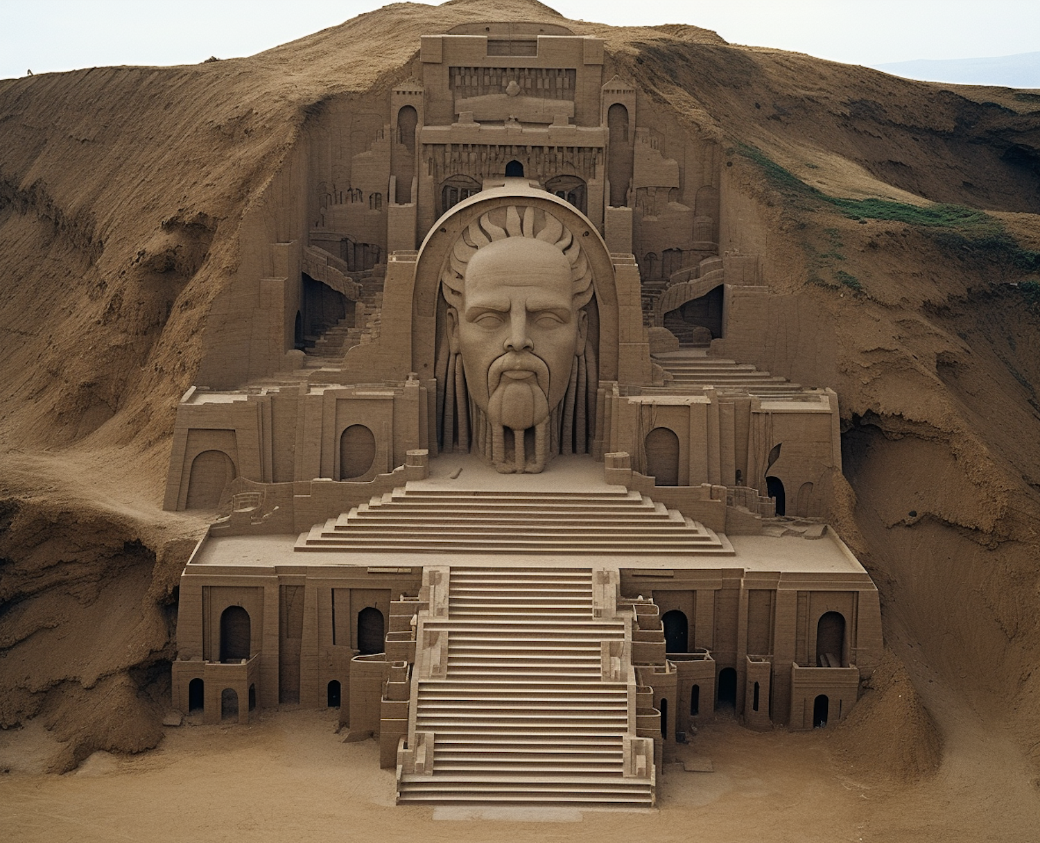 Intricate sand sculpture of a colossal face and temple facade carved into a sand dune, showcasing ancient architectural elements.