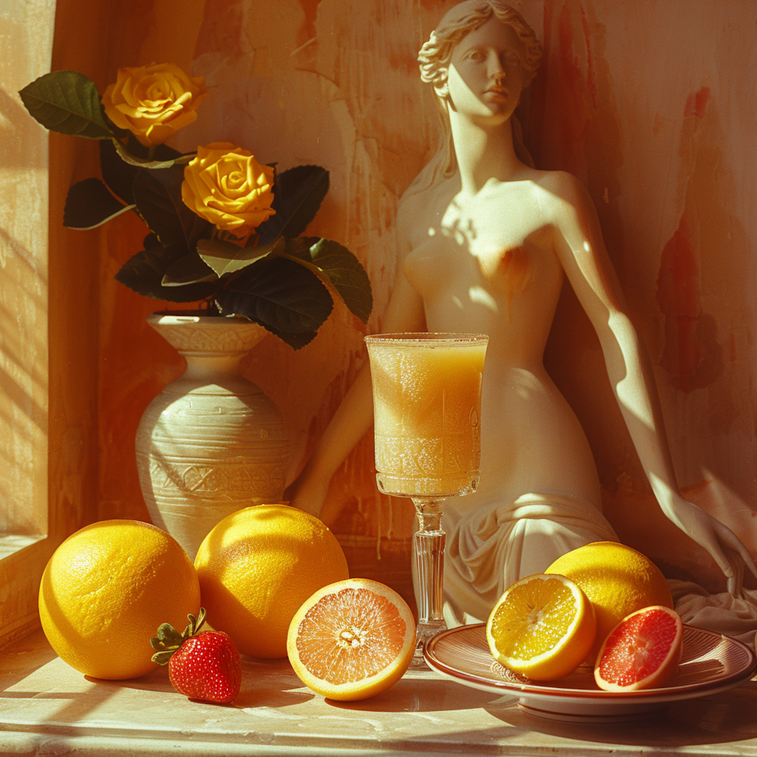 Elegant still life with citrus fruits, a marble statue, and yellow roses in warm sunlight. A glass of fresh juice adds a refreshing touch.