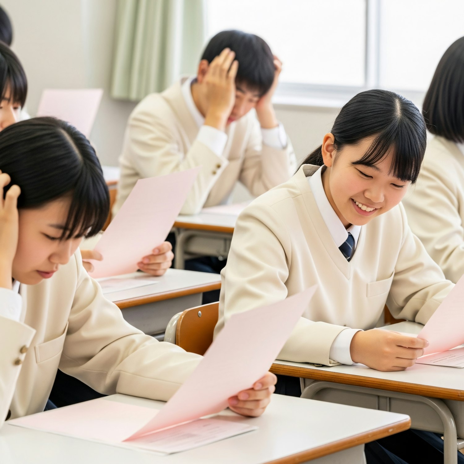 Students in a classroom wearing beige uniforms, holding pink papers, and engaged in an activity. Bright and focused atmosphere.