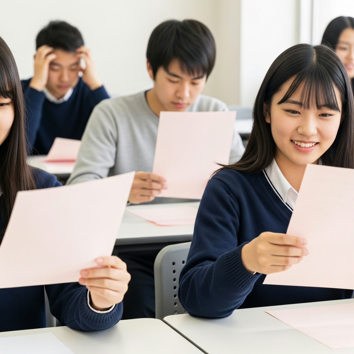 Students in a classroom reading papers, some smiling and others focused, creating a lively and engaging academic atmosphere.