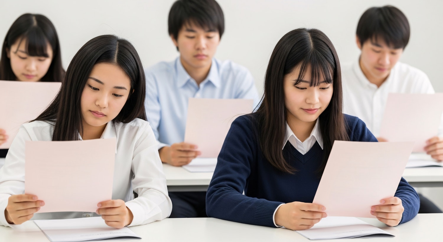 Students in a classroom setting, focused on reading documents, dressed in school uniforms, creating a studious and academic atmosphere.