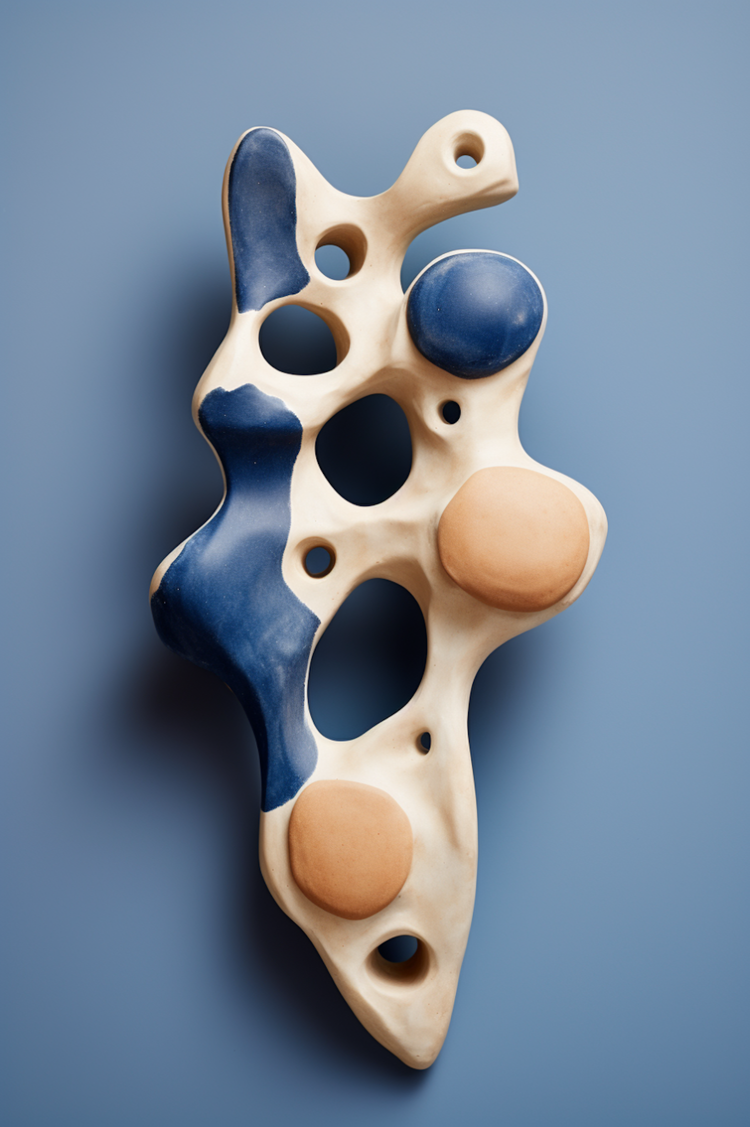Abstract ceramic sculpture with blue and beige accents on a soft blue background, featuring dynamic shapes and textures.