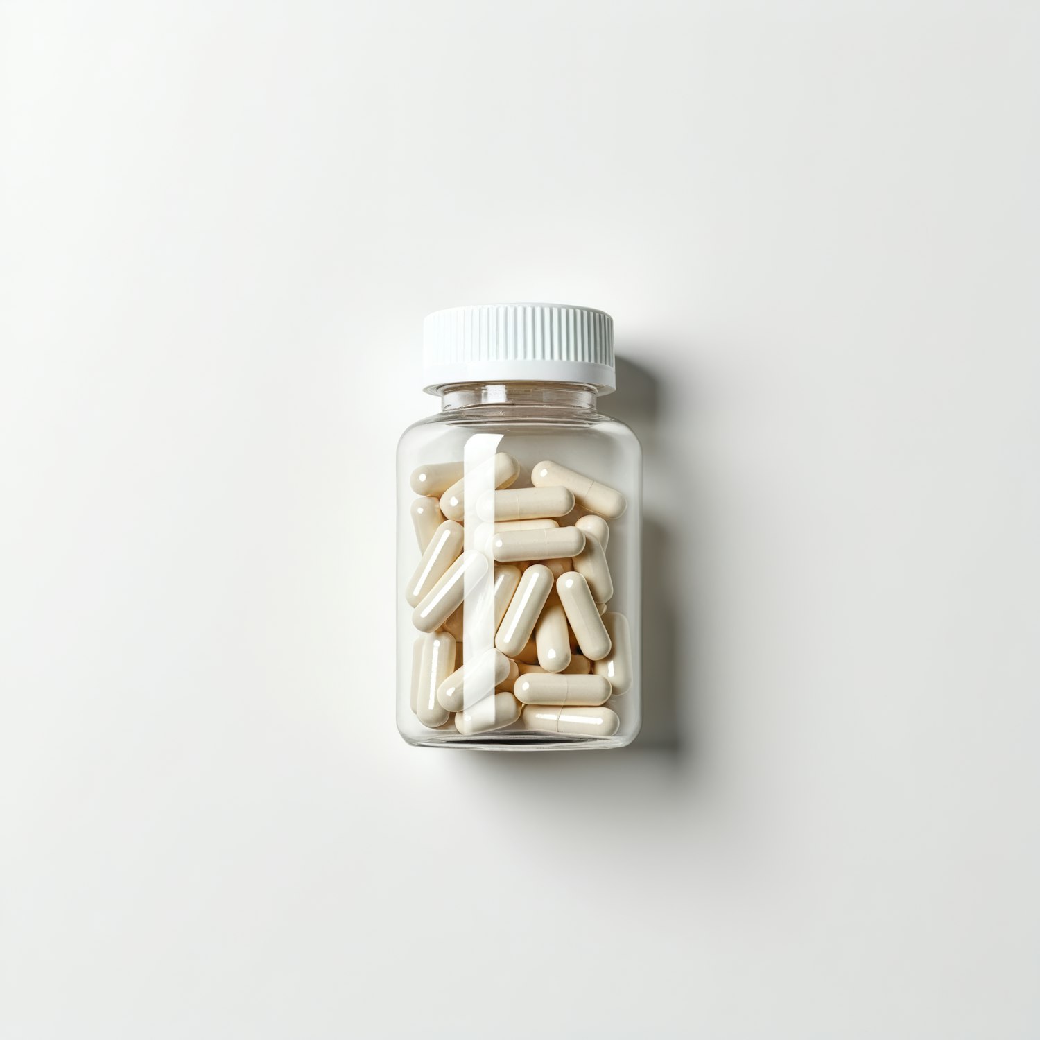 Clear bottle filled with white capsules against a plain background, showcasing a minimalistic and clinical design.