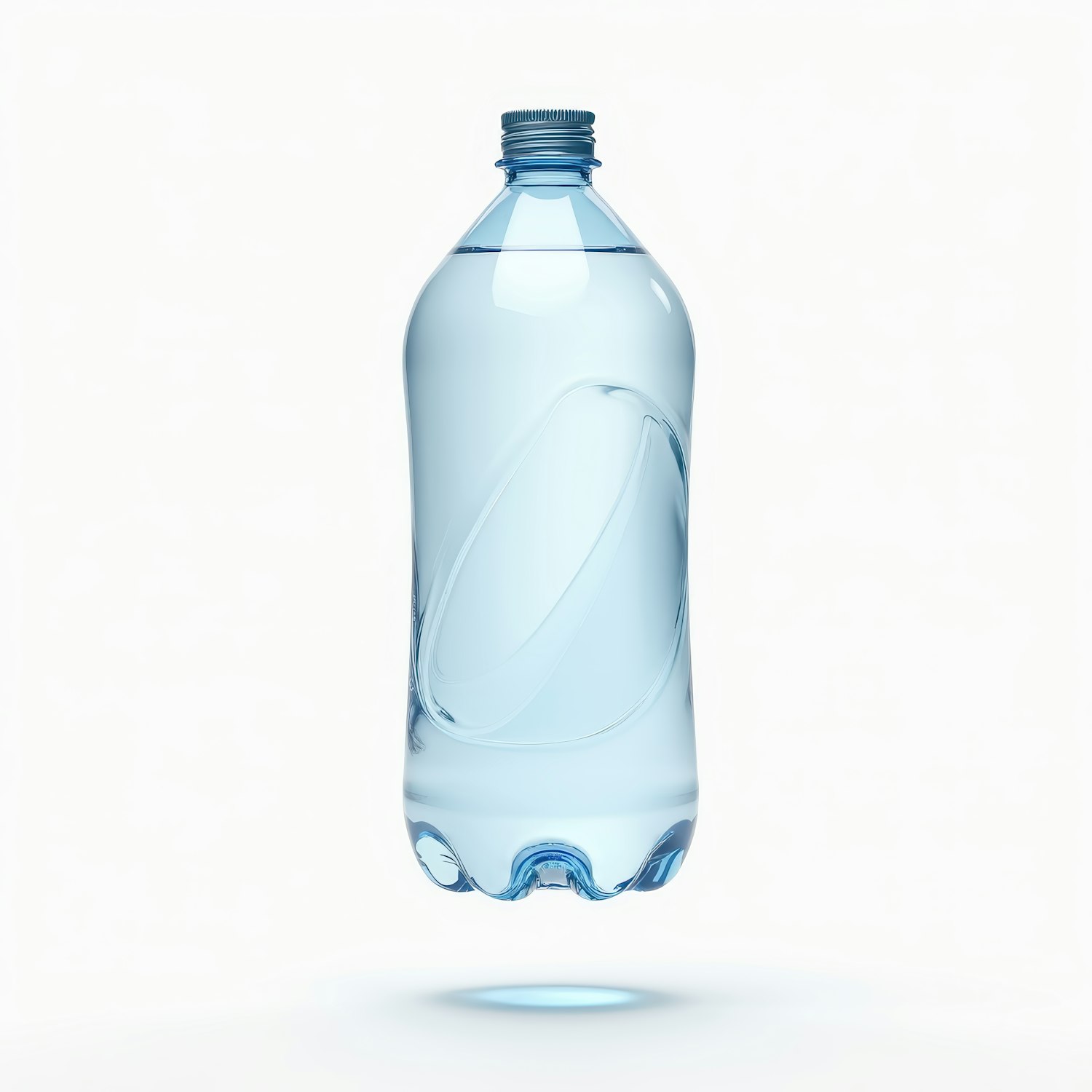 Clear plastic water bottle with blue tint on a white background, highlighting its clean and fresh appearance.