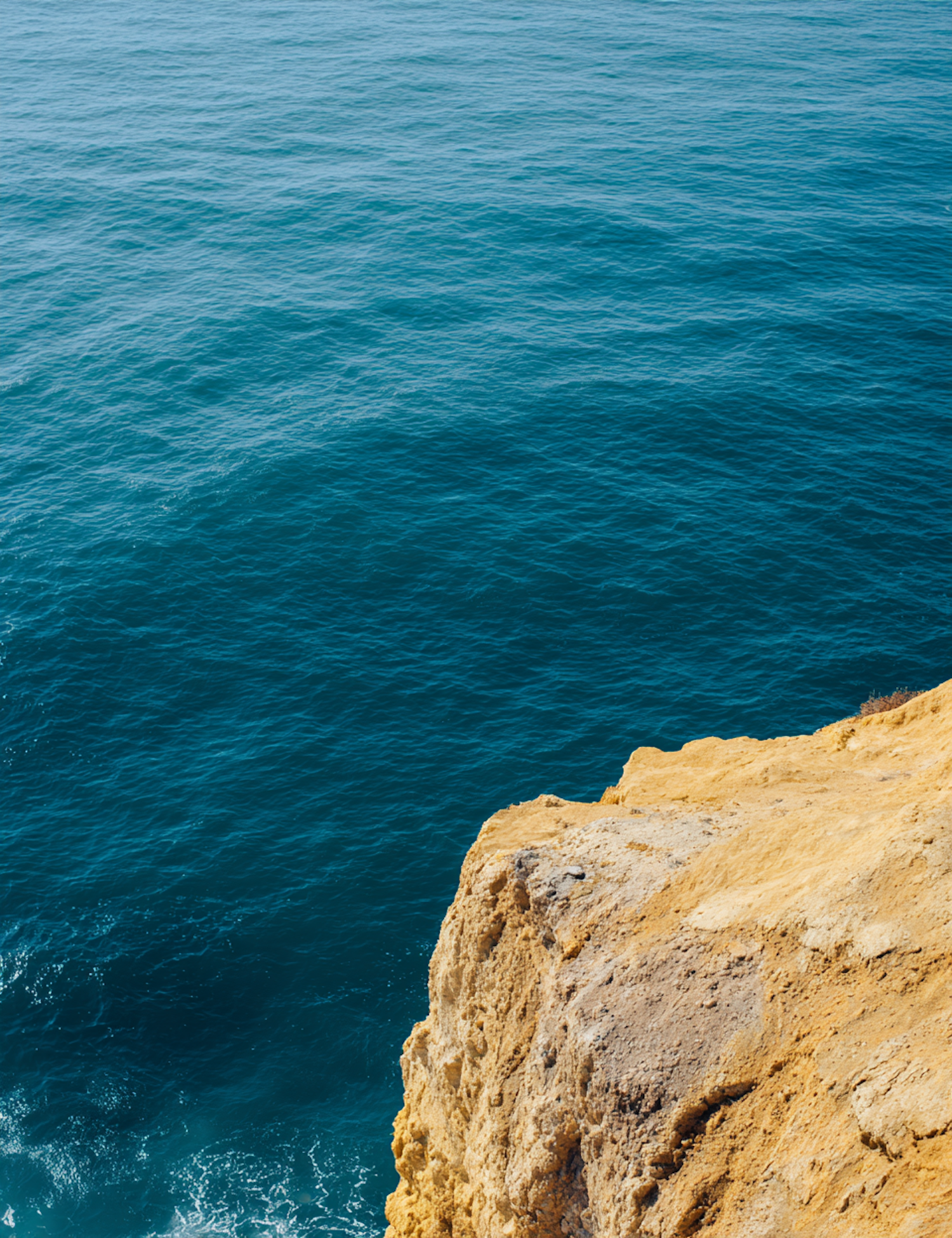 A stunning view of a rugged cliff edge against a calm, deep blue ocean, showcasing the beauty of nature's contrasts.