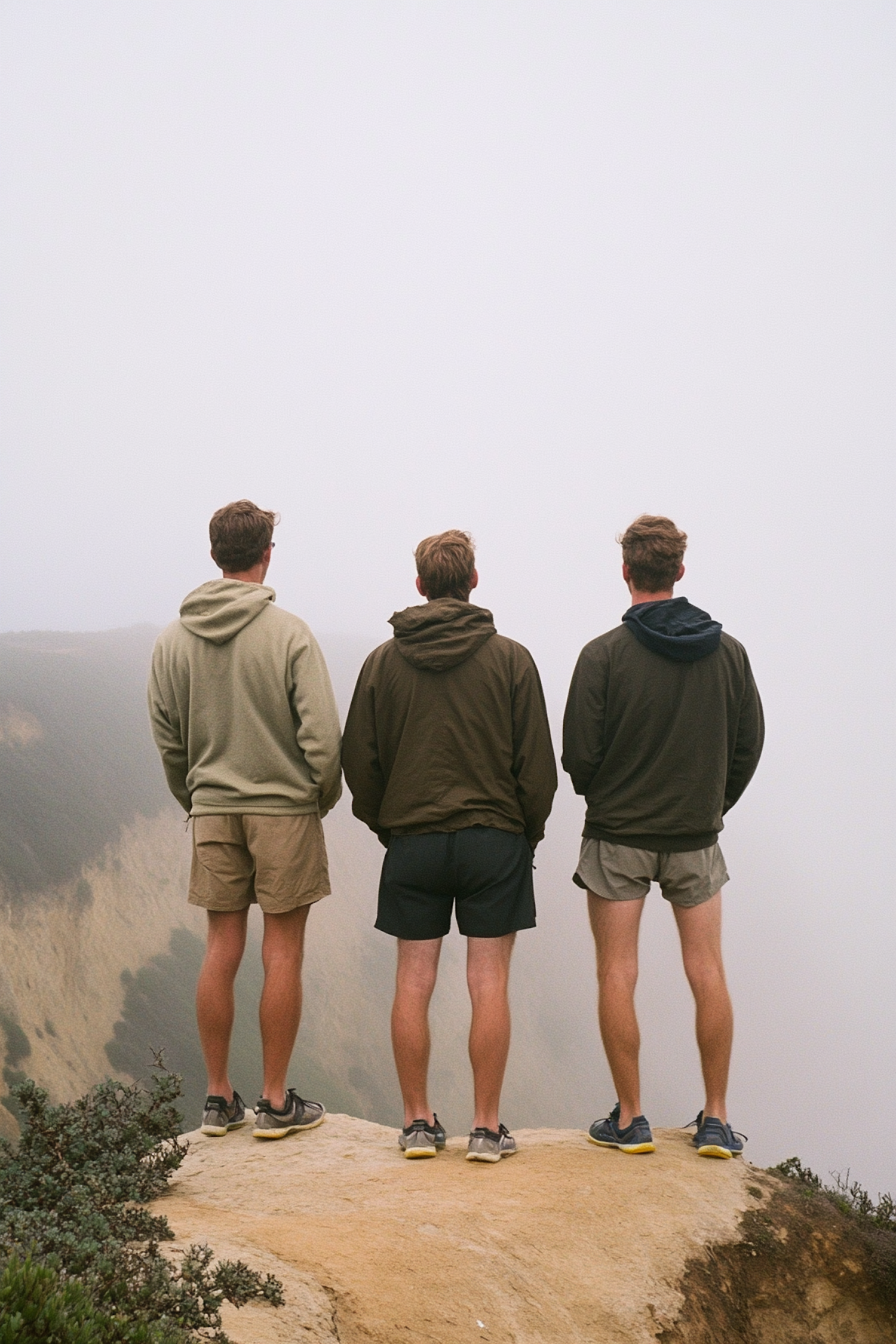 Three men in hoodies and shorts stand on a foggy cliff, gazing into the mist. Casual outdoor attire and serene atmosphere.