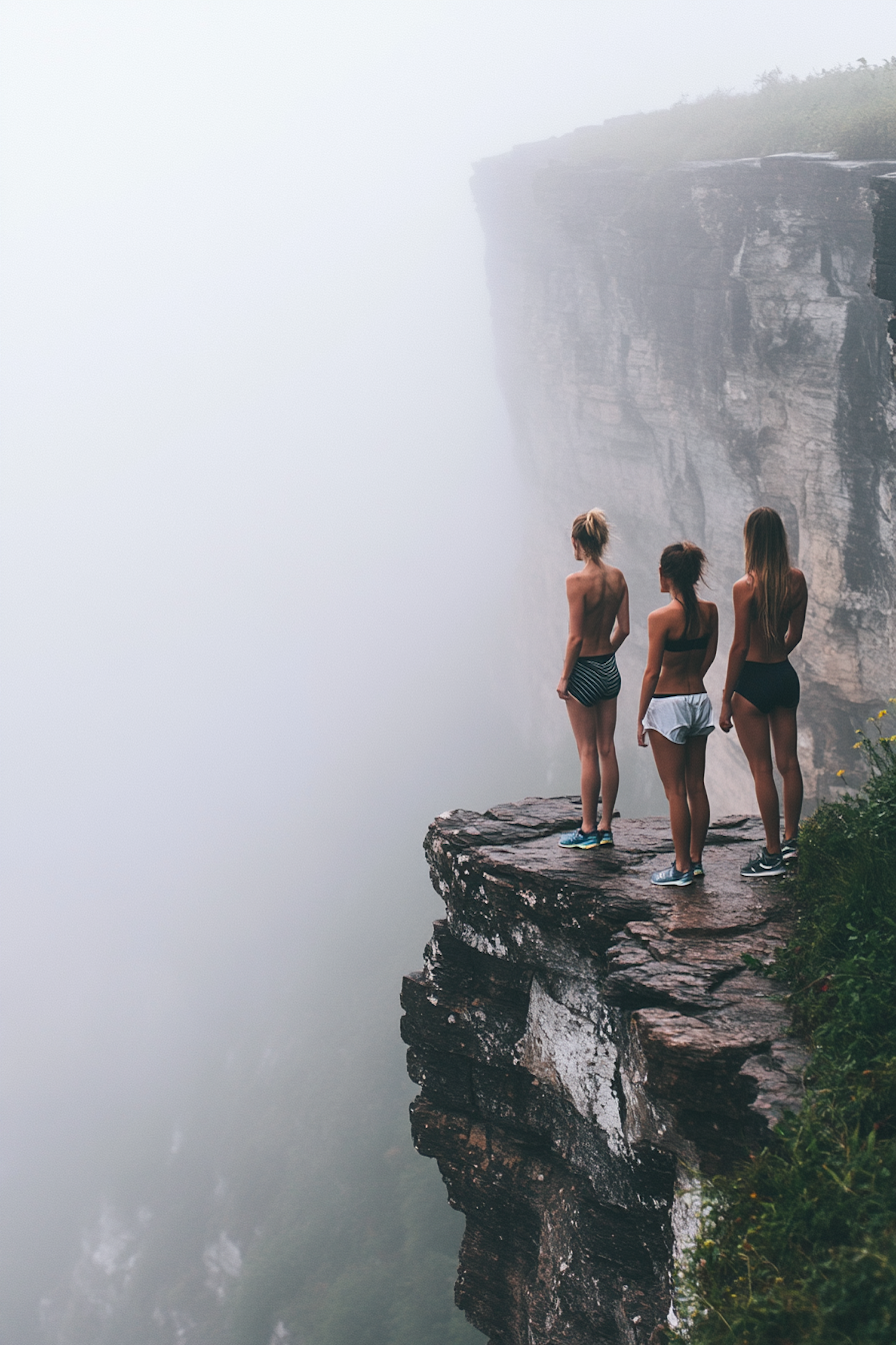 Three women stand on a foggy cliff edge, wearing athletic wear, gazing into the mist. Rugged rocks and lush greenery surround them.