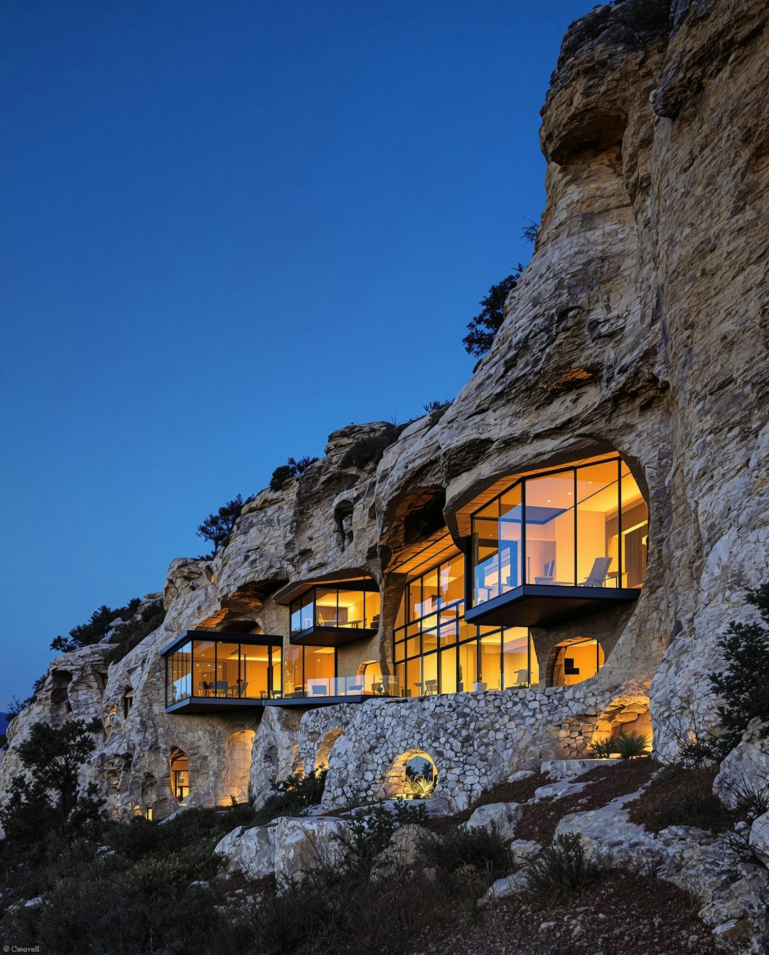 Modern cliffside home with glass-fronted rooms glowing warmly against a twilight sky, blending seamlessly with rugged natural stone.