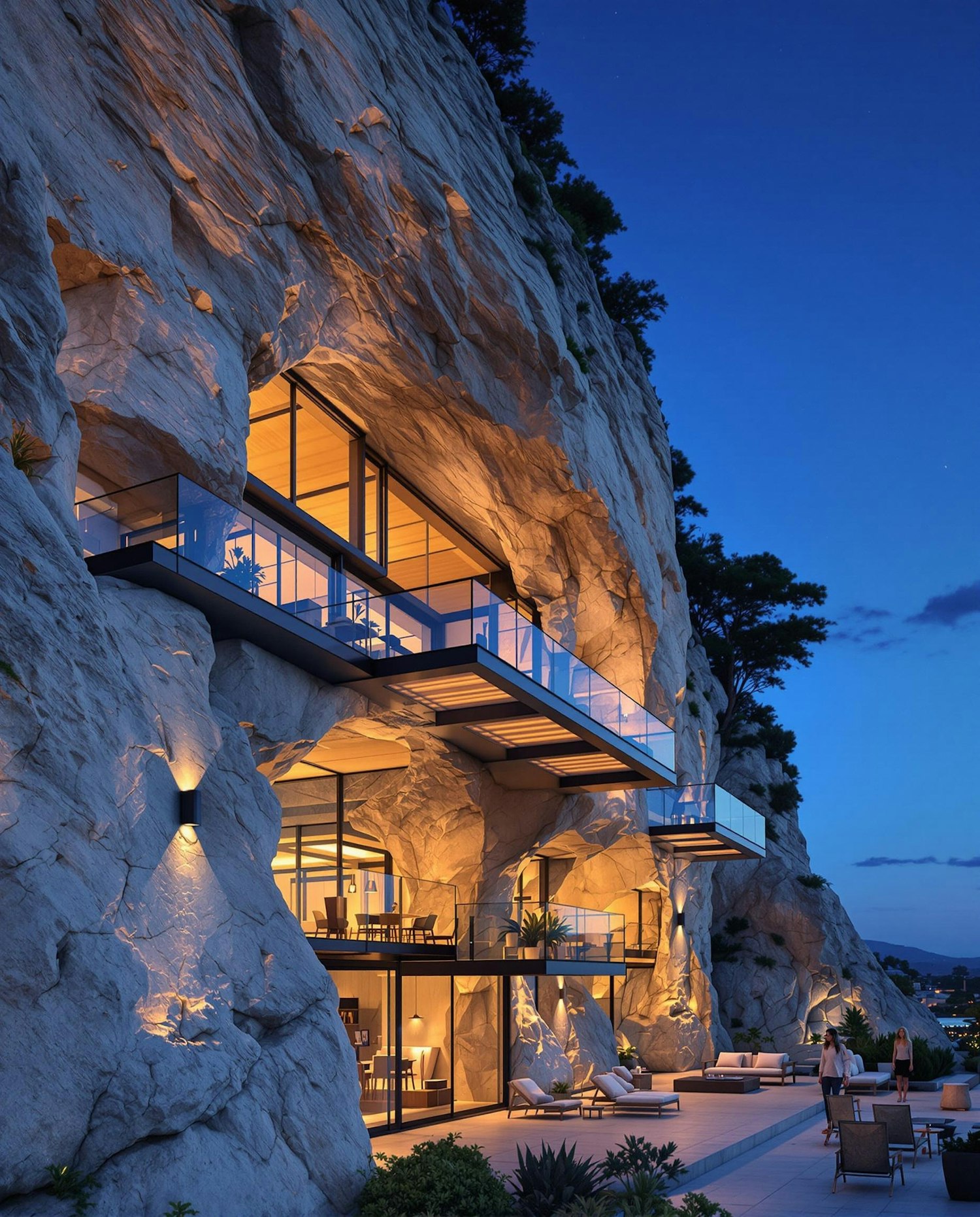 Architectural home carved directly into a limestone cliff, with glass balconies jutting out. Shot from below at twilight, with subtle interior lighting creating contrast.
