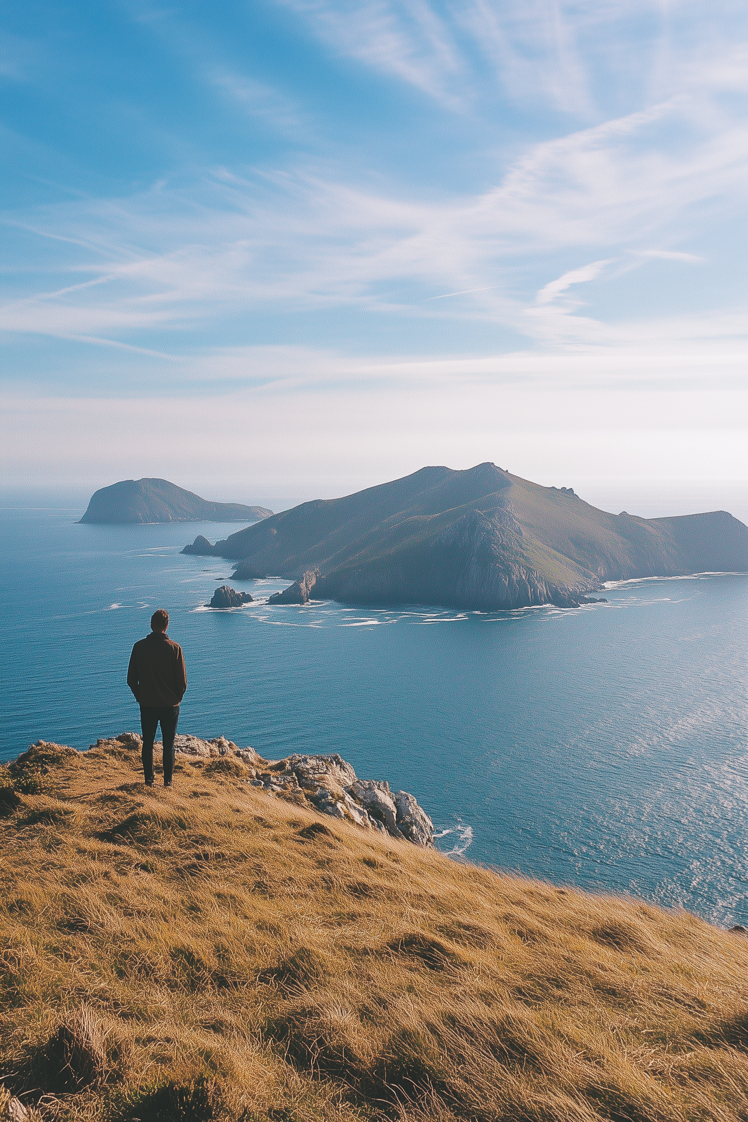 Person standing on a grassy cliff, overlooking a vast ocean and rugged islands under a serene blue sky with wispy clouds.