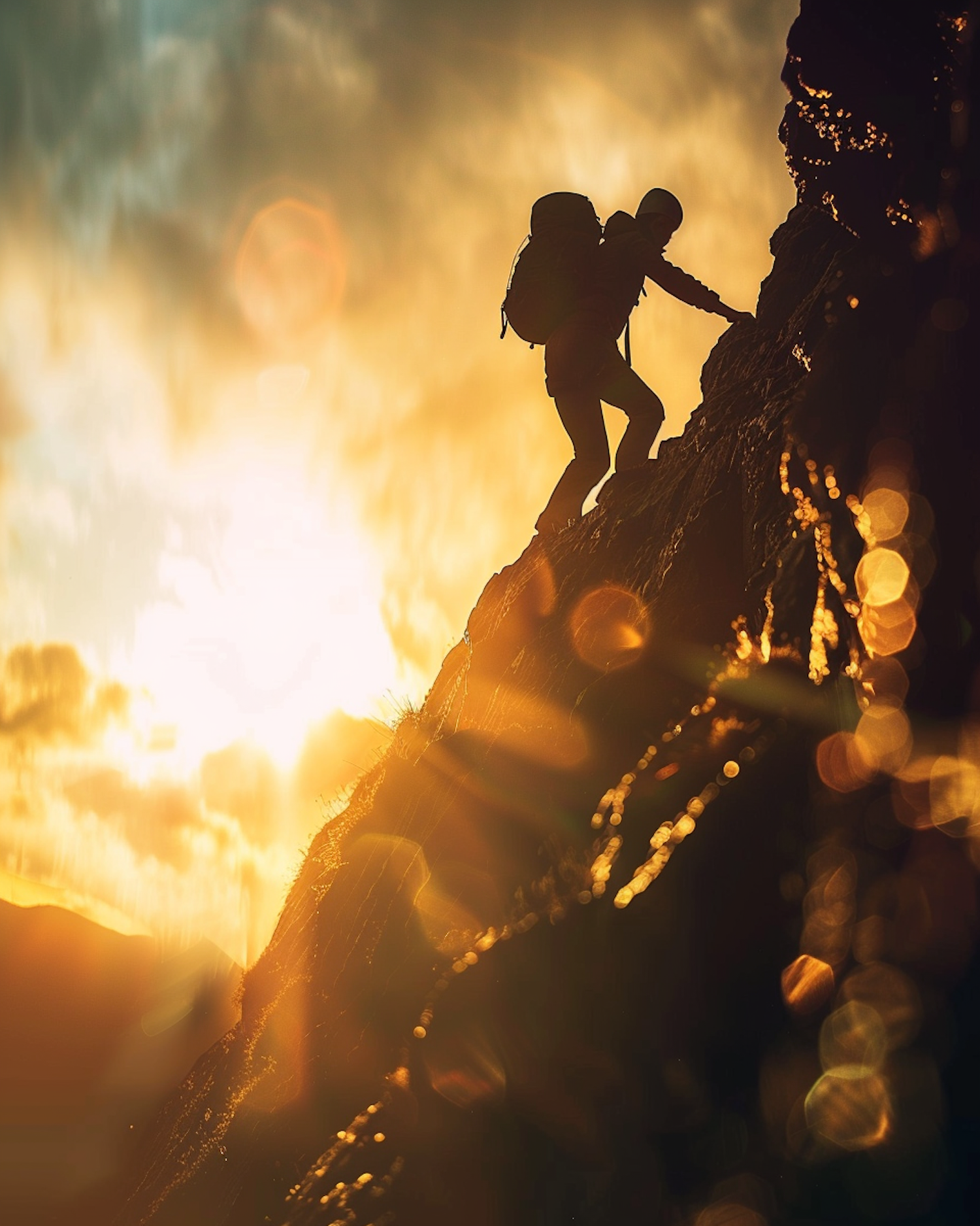 Silhouette of a climber scaling a rock face at sunset, with golden light and dramatic shadows creating a stunning outdoor scene.