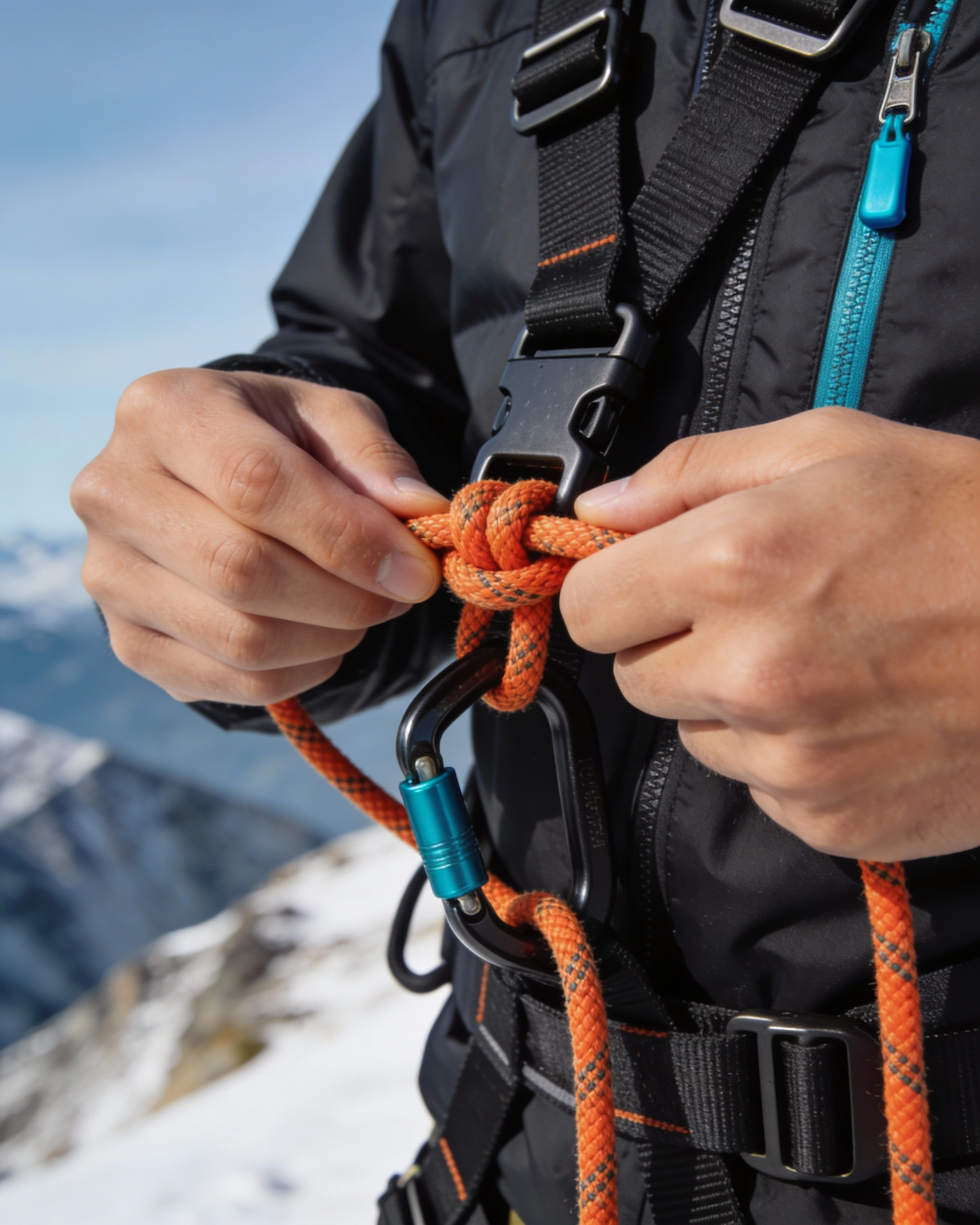 Close-up of hands tying a climbing knot with an orange rope and carabiner, set against a snowy mountain backdrop.