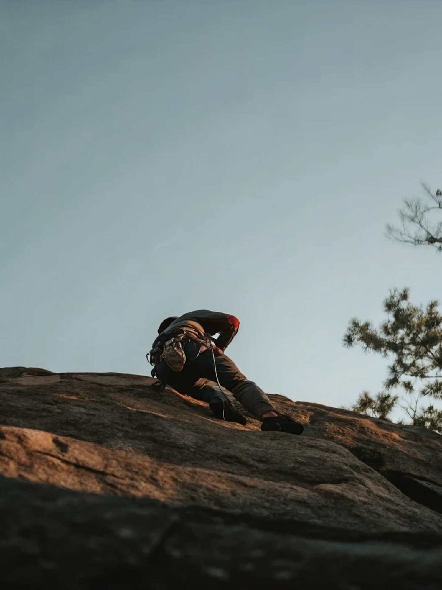 A climber ascends a sunlit rock face with safety gear, set against a clear blue sky and a touch of greenery from a nearby tree.