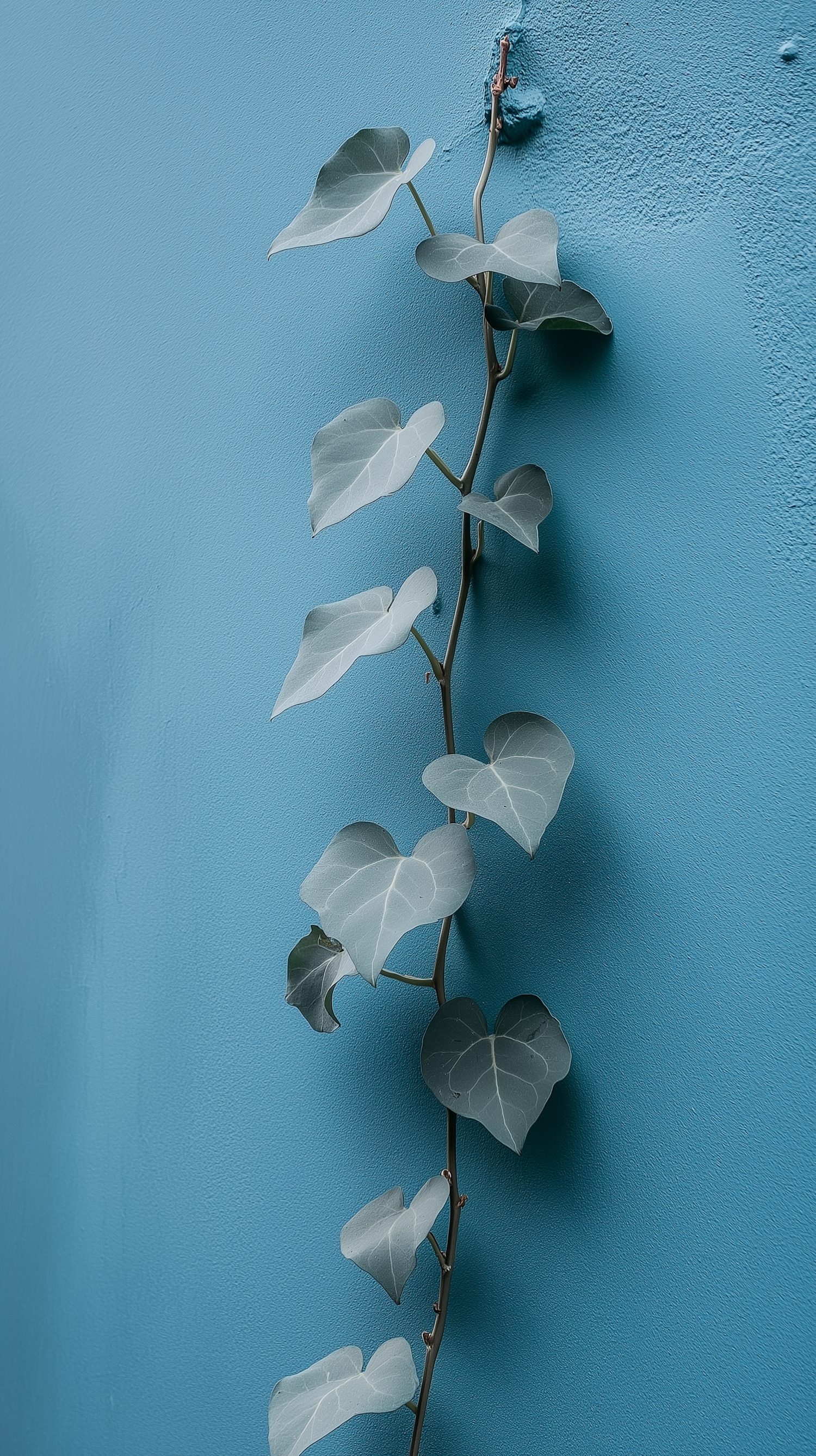 A minimalist vine with heart-shaped leaves climbs a vibrant blue wall, creating a striking contrast and natural elegance.