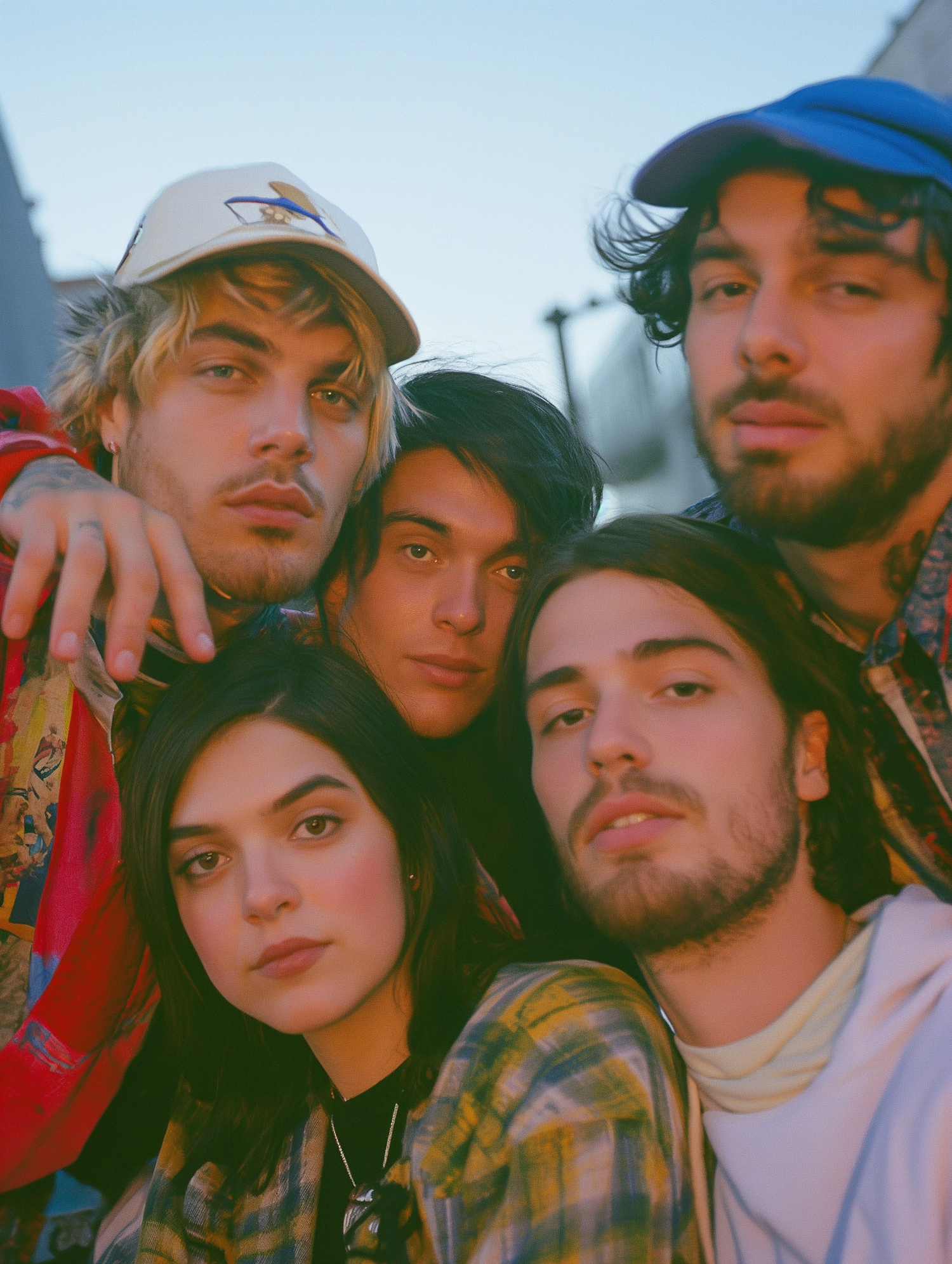A close-knit group of five young adults with diverse hairstyles and casual attire, captured in warm, late afternoon light.